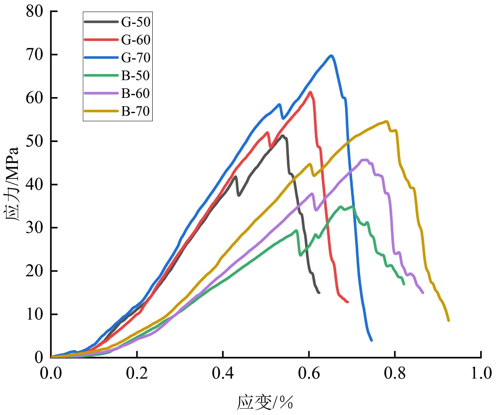 峰值后曲线形态揭示出不同的破坏机制。干燥试样,特别是岩桥较短的G-50,应力跌落陡峭,呈现典型脆性断裂特征;而饱水试样及岩桥较长的G-70、B-70等曲线下降更为平缓,显示出更高的延性和韧性,说明水分润滑与结构完整性增强均促使破坏模式由脆性向延性转化。