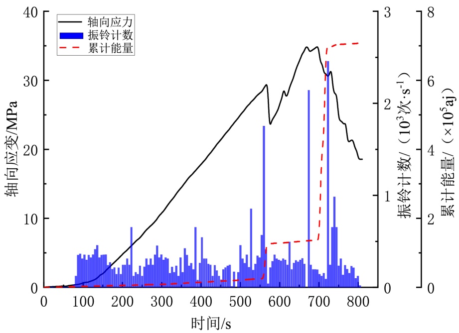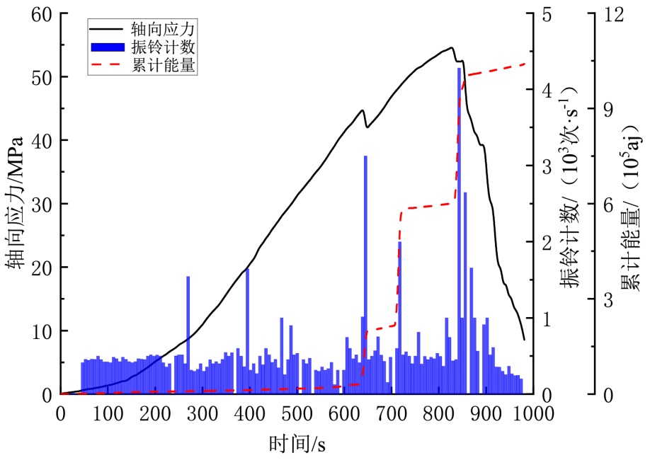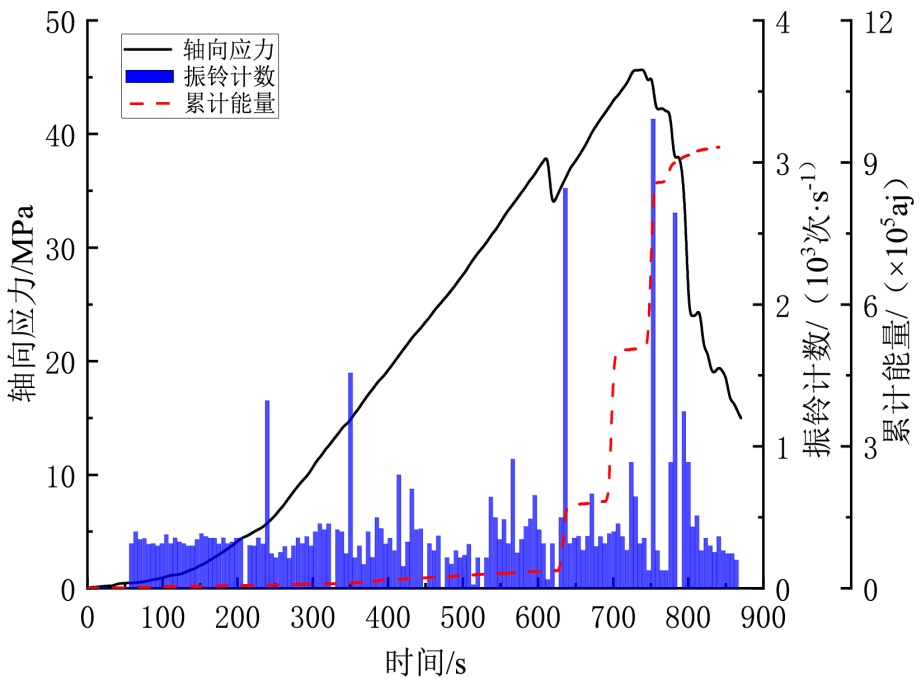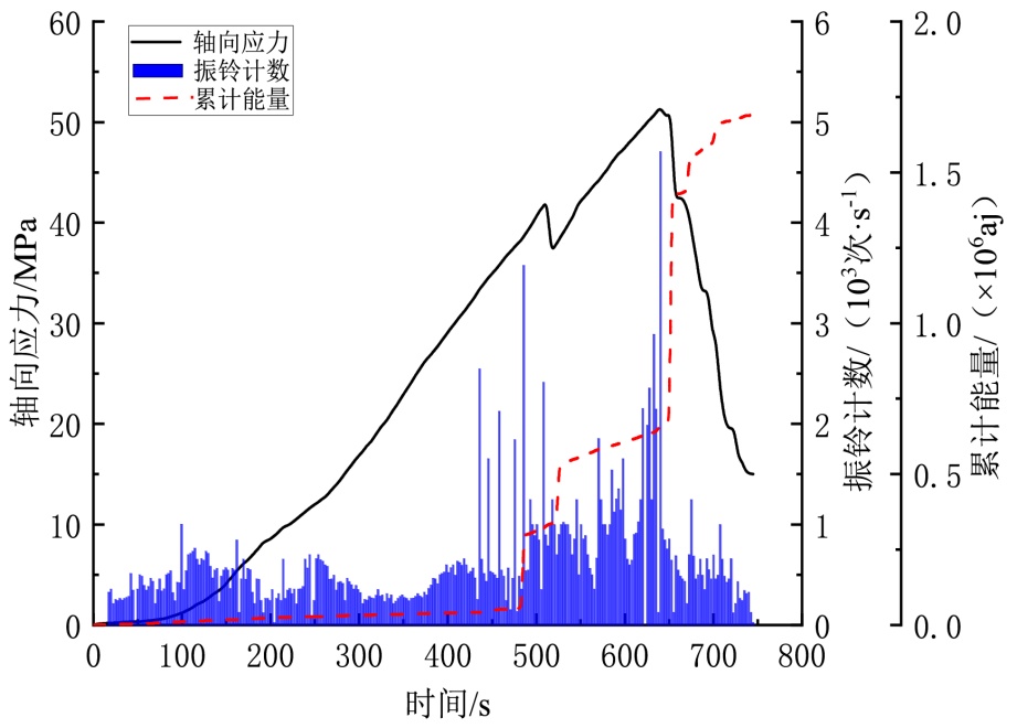 图4. 应力、声发射振铃计数与累计能量的时间关系