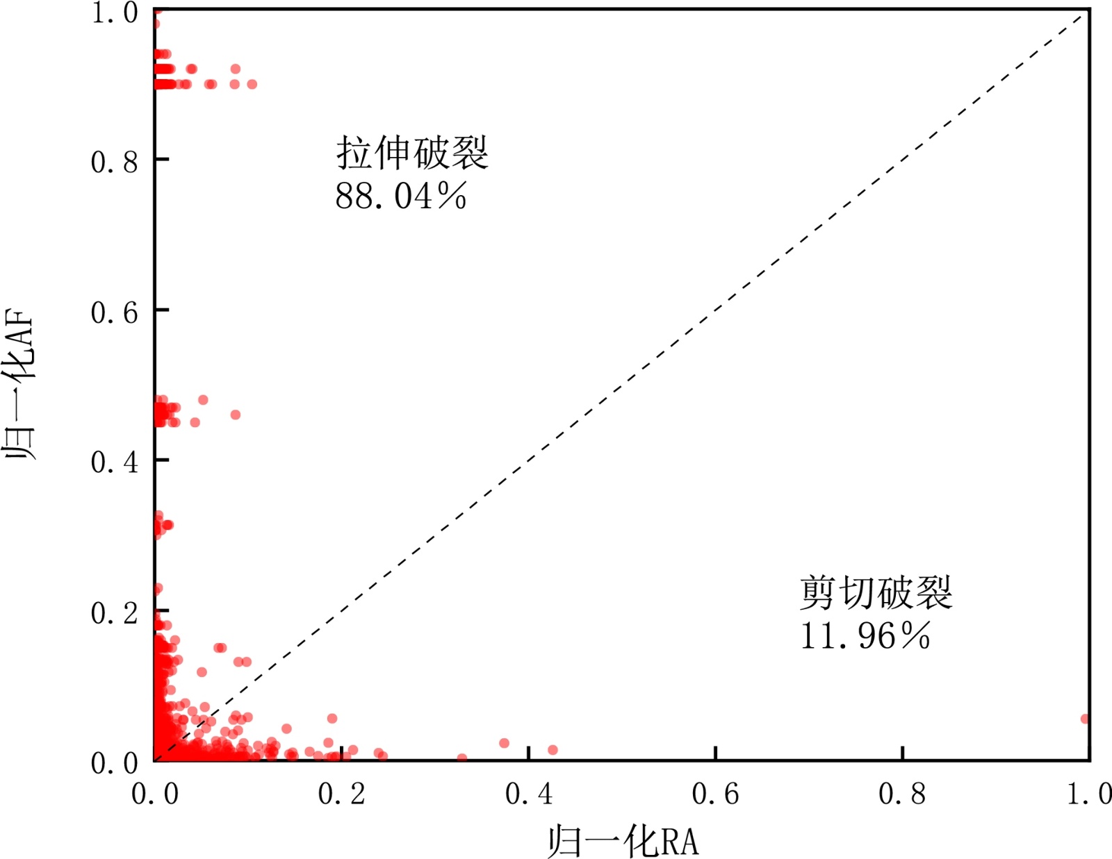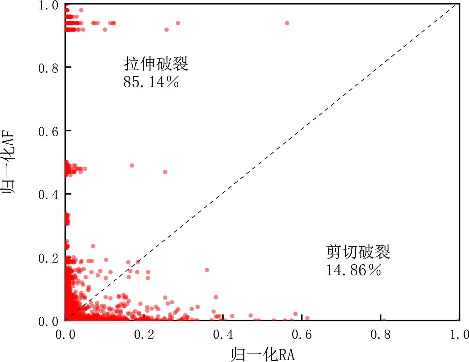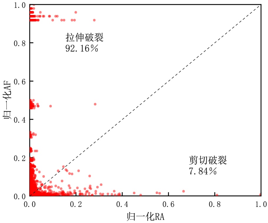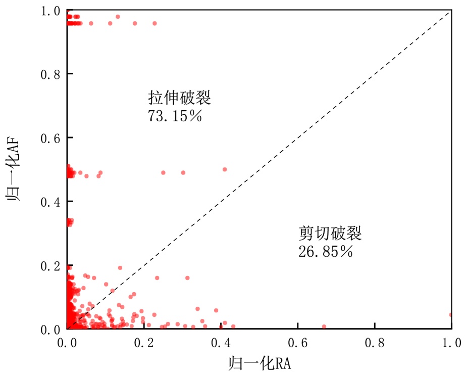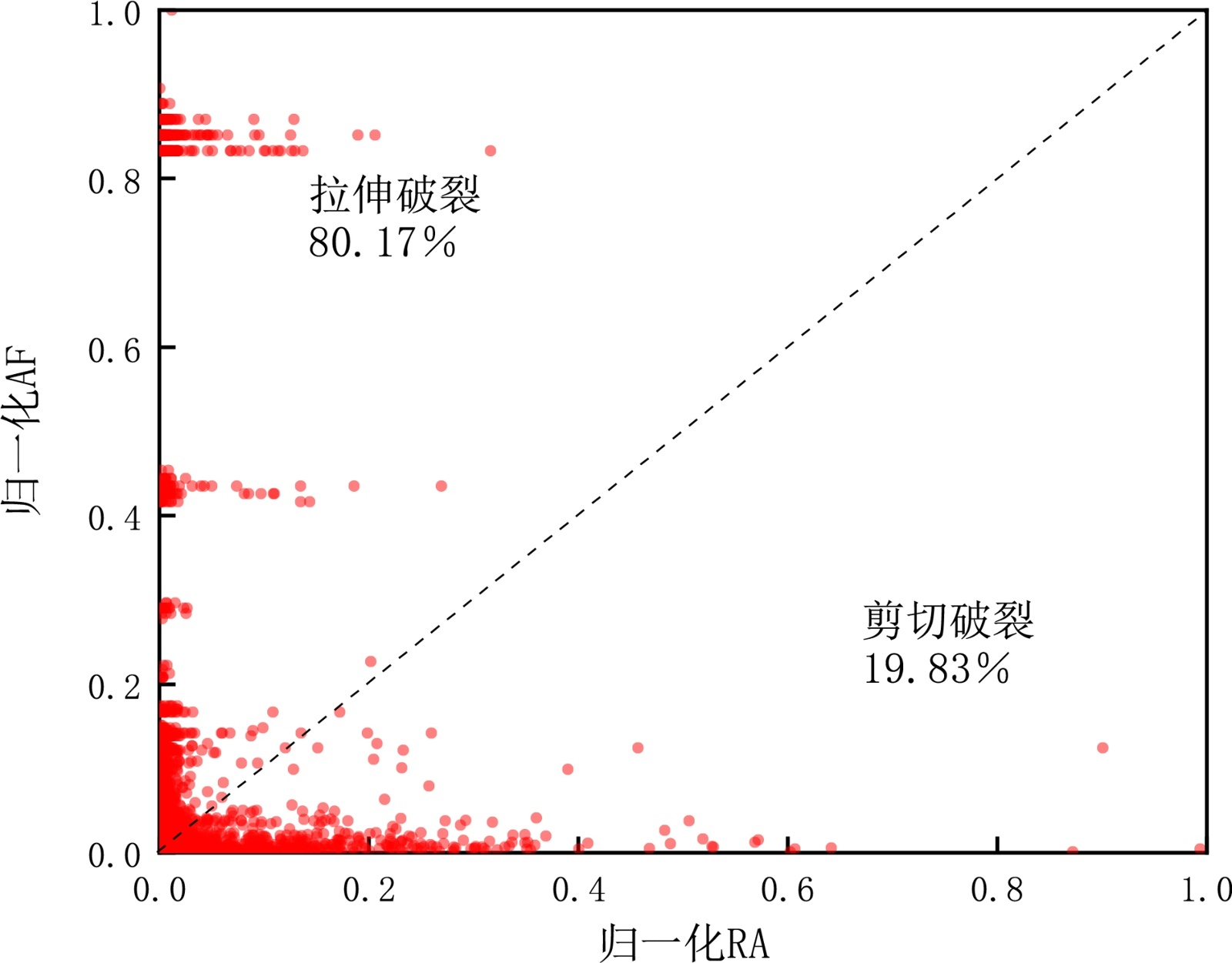 单轴压缩下,红砂岩试样的主导破裂模式为拉伸裂纹与剪切裂纹。加载全过程中,通过声发射技术可实时捕获岩石内部损伤演化特征,基于声发射信号RA值与AF值的耦合分析,能实现微观破裂类型的精准判识:低RA值–高AF值信号对应拉伸型裂纹,高RA值–低AF值信号关联剪切型裂纹,对角线附近RA值与AF值相近的信号则对应复合类型裂纹[9] (图5)。