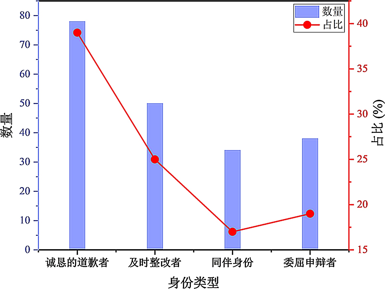 为深入探究商家在应对网络差评时所建构的语用身份类型及其分布规律,本研究对收集的200条有效差评回复进行统计与归类。统计结果如图1所示。