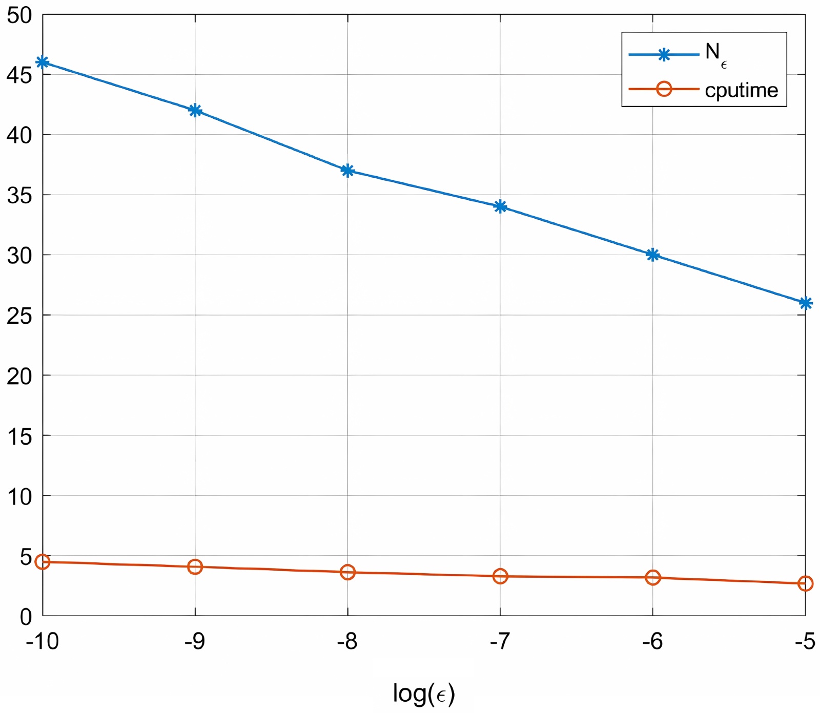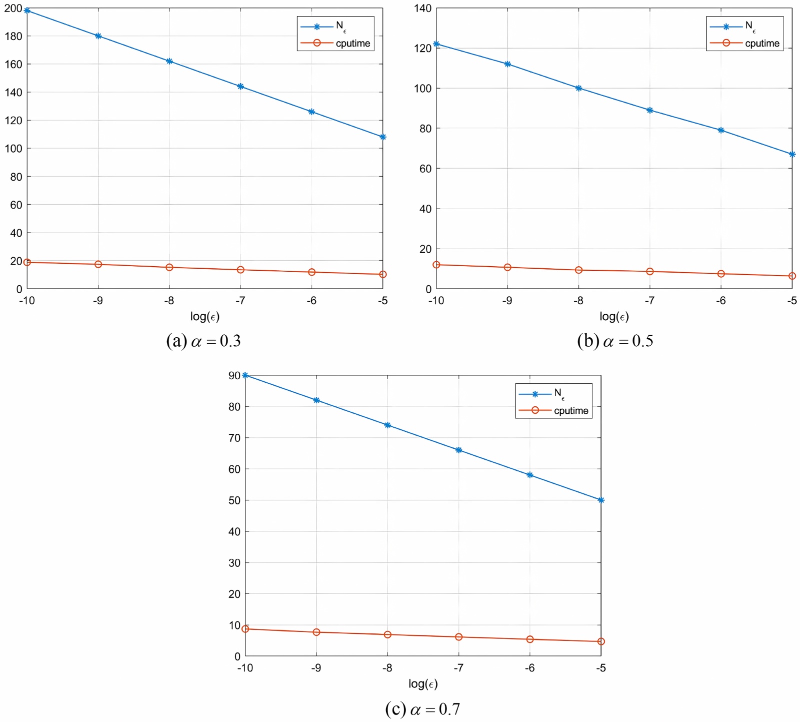 阶,在空间上的收敛阶达到4阶,并给出误差估计的证明。同时,通过数值算例对比了两种格式的差异性,体现了SOE快速化算法的有效性,在保证收敛阶稳定的同时,能够在很大程度上降低计算成本,并且验证了该数值格式可以结合梯度网格技巧去解决具有初值奇异性的问题。同理推出这两种格式在任意维度上都具有很好的计算效果。