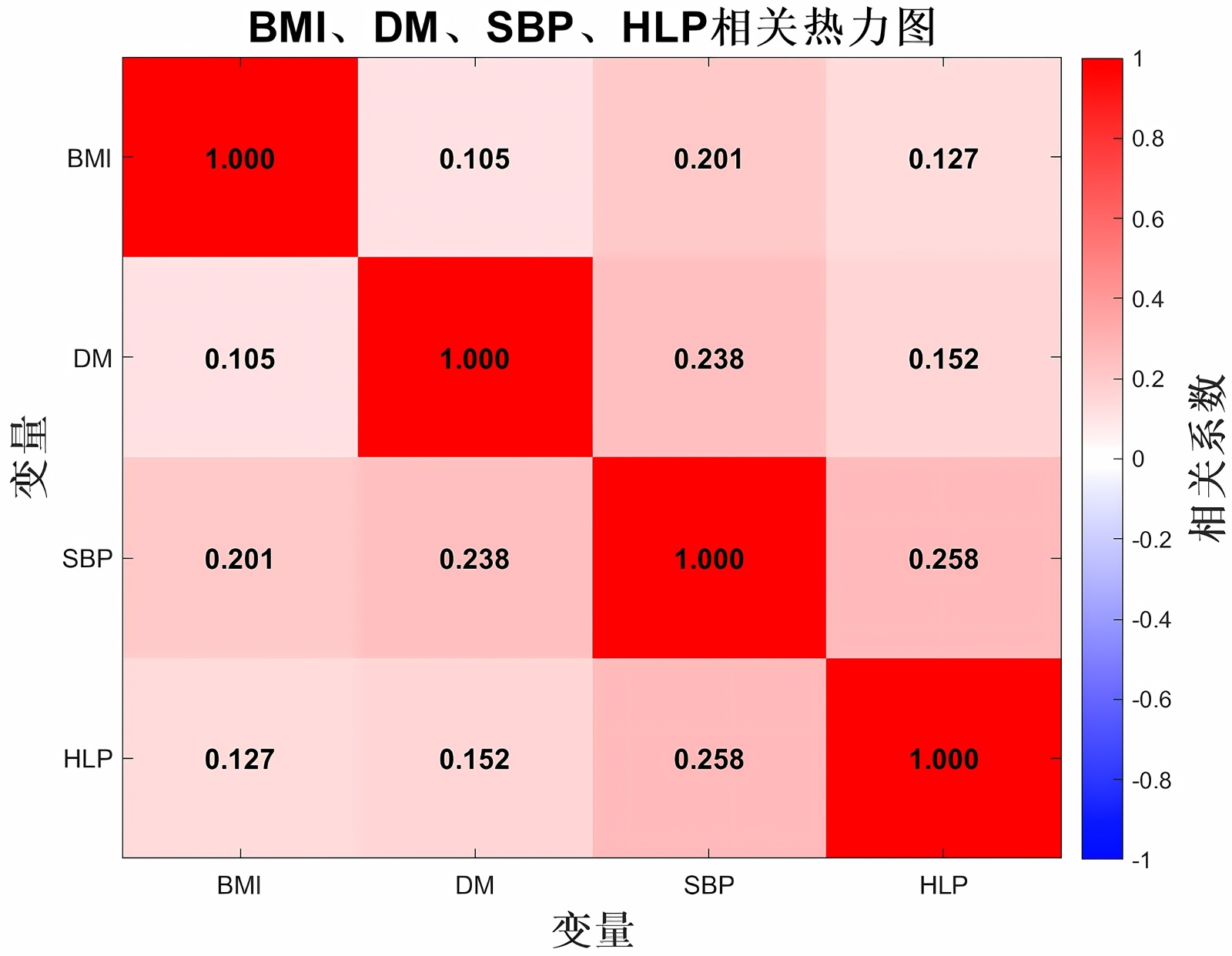 首先,卡方检验与相关性分析显示,BMI、DM、SBP、HLP之间存在弱至中等程度的正相关(相关系数0.105~0.258),其中SBP与HLP的关联强度相对最高。