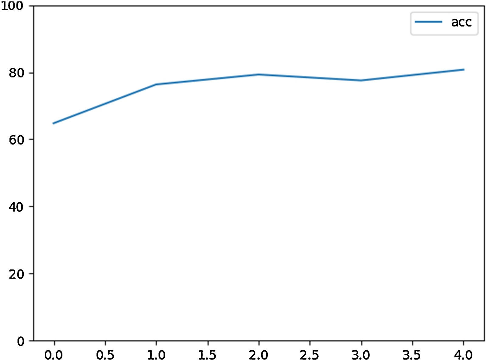 该图呈现模型准确率随训练轮数的增加而产生的变化,其中横轴表示训练轮数,纵轴表示准确率。每轮所得准确率为:[64.789, 76.355, 79.304, 77.545, 80.760]。当完成4轮训练后,模型准确率已处于较高水平。