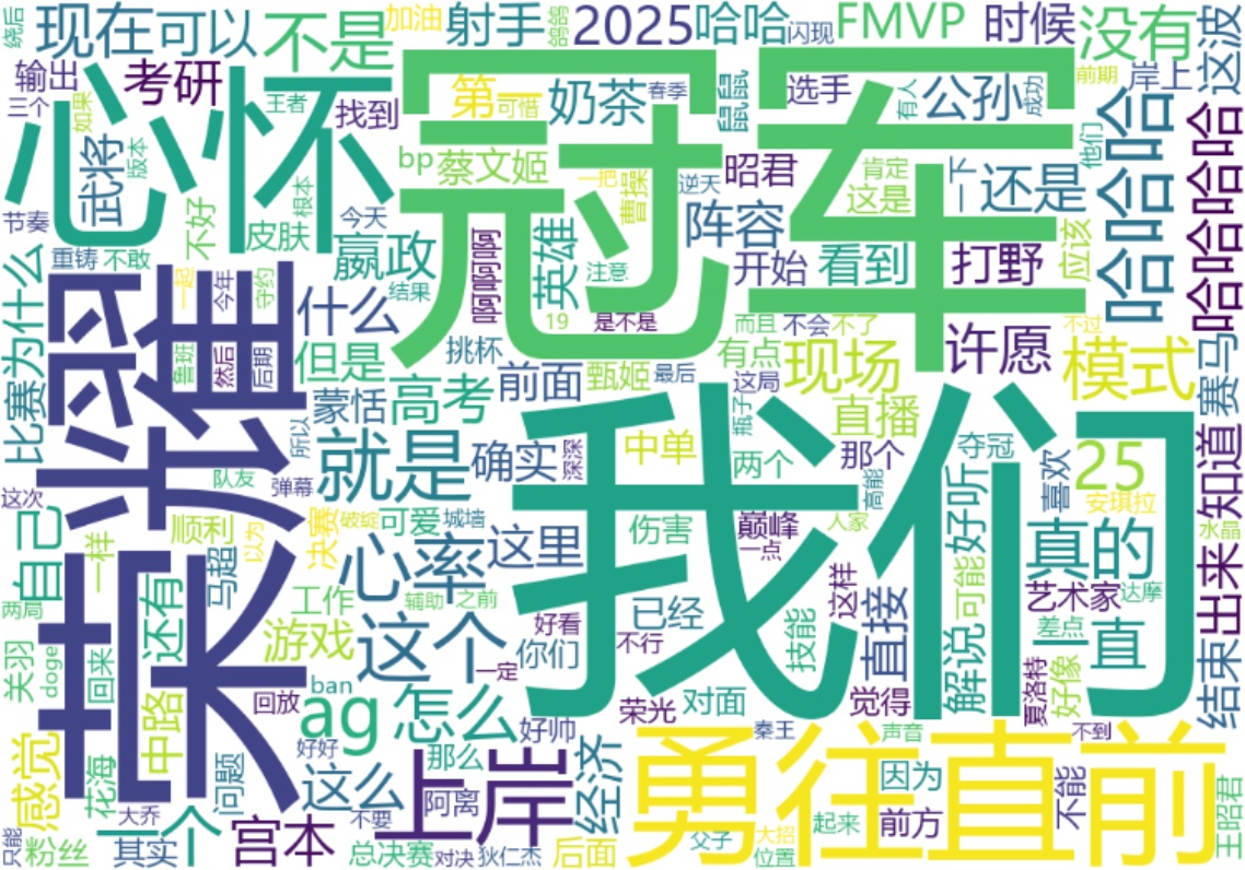 通过对弹幕高频词的分析,研究发现观众的情感倾向主要以积极为主,他们对比赛的热情、对胜利的期待以及对游戏内容的兴趣都在弹幕中得到了体现。这些高频词汇不仅为我们提供了观众情感的直接证据,也为进一步的文本分析和情感分析提供了丰富的上下文信息。