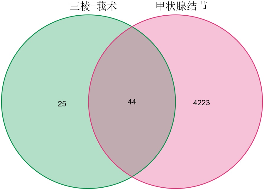 在GeneCards数据库中检索到与甲状腺结节相关的治疗靶点共4184个,于OMIM数据库中获得该疾病的靶点信息计193个;将两库结果整合后去除重复条目,总计得到4267个治疗靶点。随后借助韦恩图平台将三棱–莪术预测靶点与甲状腺结节靶点取交集,筛选出共同靶点44个,并绘制相应韦恩图,如图1所示。