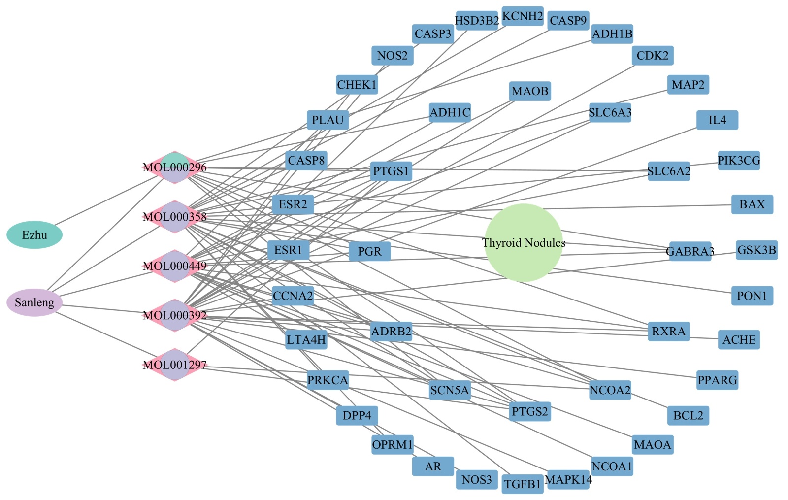 网络药理学分析结果显示,三棱–莪术作用于甲状腺结节的关键活性成分包括反式贡多糖酸、常春藤皂苷元、β-谷甾醇、芒柄花黄素、豆甾醇、双去甲氧基姜黄素,其主要作用靶点为PTGS2、PPARG、BCL2、CASP3、ESR1、GSK3B、TGFB1、ESR2、CASP8、CDK2等。