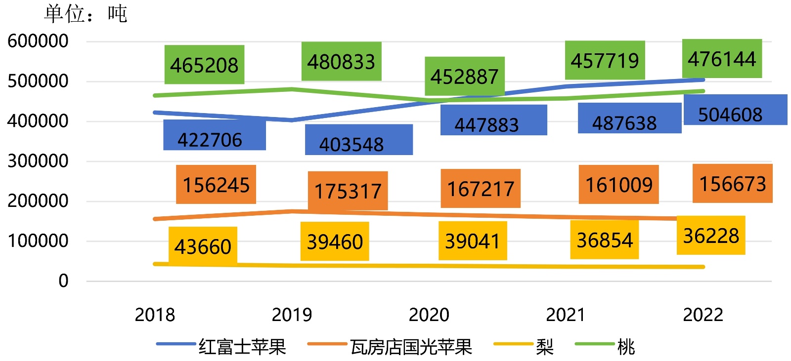 大连市地处环渤海经济圈核心,特色农产品产量连续多年保持稳定,如图1,图2所示大连市地处环渤海经济圈核心,特色农产品产量连续多年保持稳定:2022年特色水果产量合计约117.37万吨,其中“红富士苹果”产量50.46万吨、“瓦房店国光苹果”产量15.67万吨、“桃”产量47.61万吨、“梨”产量3.62万吨;2023年特色蔬菜中“大白菜”产量约44.10万吨、“黄瓜”产量约25.57万吨,整体呈稳中有升态势[8]。