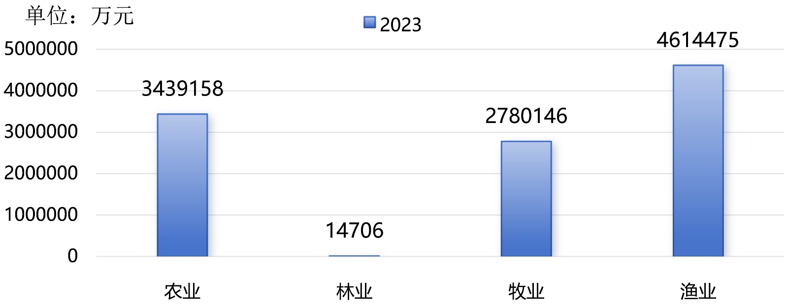首先高质量发展有助于充分发挥大连市得天独厚的滨海资源与生态条件,为推进特色农业规模化、标准化生产提供坚实基础,凸显土地作为基本生产要素的重要价值。同时大连市作为我国重要的特色农业基地和渔业主产区也为辽宁沿海经济带全面振兴提供重要支撑[9]。其二,大连市现代农业产业的高质量发展,对辽宁沿海经济带振兴发展具有显著的带动作用,能够通过三产融合与科技创新,为区域经济转型注入新动力,有助于依托滨海资源和特色农业基础,延伸水果深加工、海洋生物经济等产业链条,培育“农业 + 文旅”“农业 + 康养”多元业态。其三,借助智慧农业和数字渔业等现代科技手段,有助于突破资源环境约束,提升农业生产效率和竞争力。如图3所示,2023年大连市农业产业生产总值结构呈现“渔业主导、农牧并重、林业占比极小”的特征:渔业产值约4,614,475万元,为四大产业中最高;农业约3,439,158万元居第二;牧业约2,780,146万元位列第三;林业仅约14,706万元,规模明显偏小。整体上,渔业对大连第一产业贡献最为突出。其四,通过打造“大连苹果”“大连海参”等国家地理标志品牌和完善“冷链 + 电商”物流体系,有助于大连市深度融入国内国际双循环[10]。这一发展路径不仅能够保障区域特色农产品安全,也有助于探索生态产业化路径,将滨海生态优势转化为经济优势,为辽宁沿海经济带全面振兴提供持久动力。