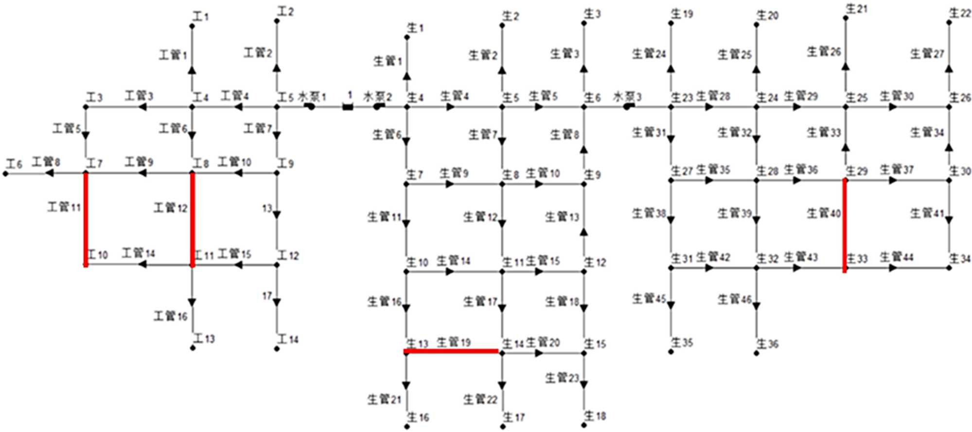 当城市供水管网破坏程度大时,即累积概率值介于2.5%和97.5%之间,工业用水区编号为3、4、9和10的供水管线以及生活用水区编号9、10、14、15、19、20、35、36、37、42、43和44供水管线无法正常工作,如图6所示,图中红色部分为无法正常工作的供水管线。