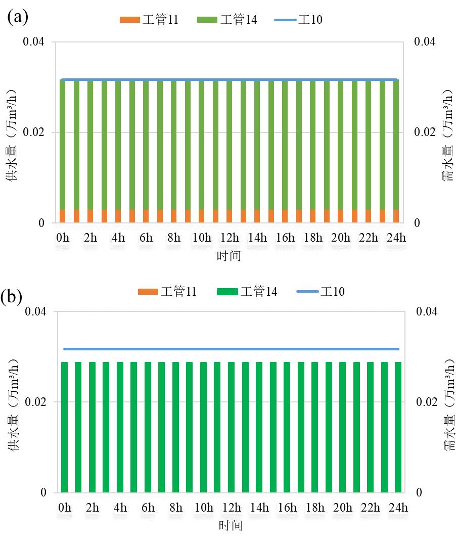 图7. 正常工况(a)以及极端工况(b)下工业用水节点11供需水情况