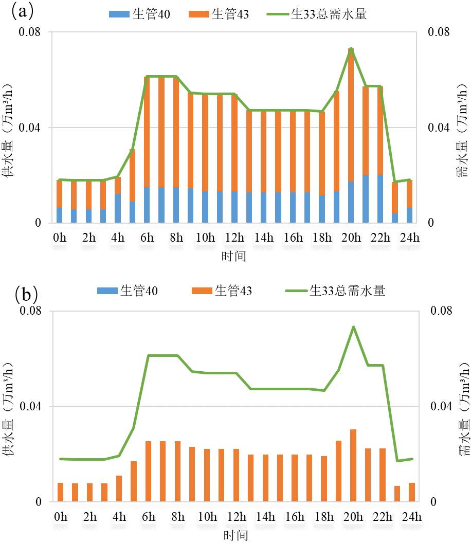 图5. 正常工况(a)以及极端工况(b)下生活用水节点33供需水情况