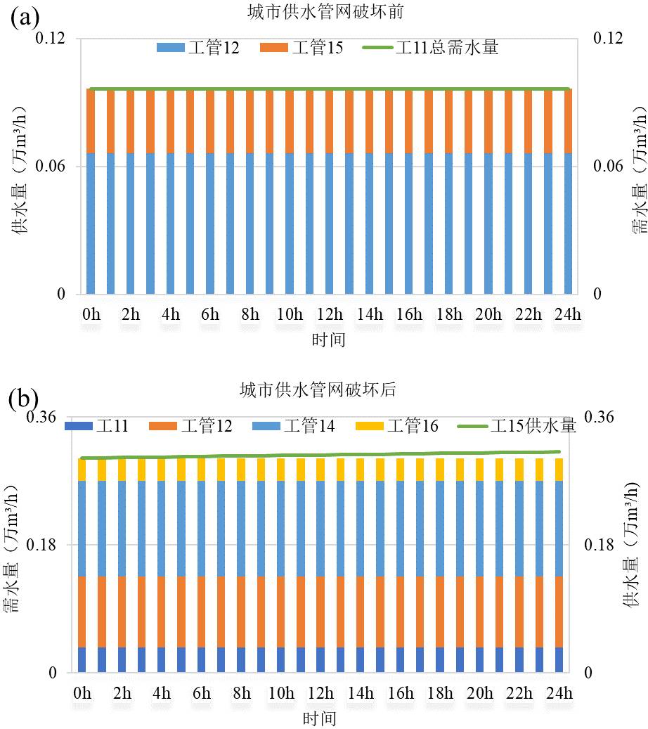 1) 城市供水系统遭受破坏前,工业用水节点11的需水量由供水管线12和15提供,且该节点的主要功能是为工业输水管线14、16及其连接的节点供水。此时,工业用水节点11的供需水量平衡,没有出现缺水现象,如图7(a)所示。而城市供水系统遭受破坏后,工业用水节点11的需水量包含节点本身的需水量、供水管线12、14以及16的需水量,并且只由工业供水管线15提供,来满足其本身及下游节点的用水需求。如图7(b)所示。以上结果表明,尽管灾后极端降雨对供水管网造成了较为严重的影响,但供水管网系统的灵活性使得部分供水管线在不超出自身最大供水能力的前提下,能够通过适当调整供水范围来扩大供水覆盖区域,从而保证了城市供水系统的正常运行。