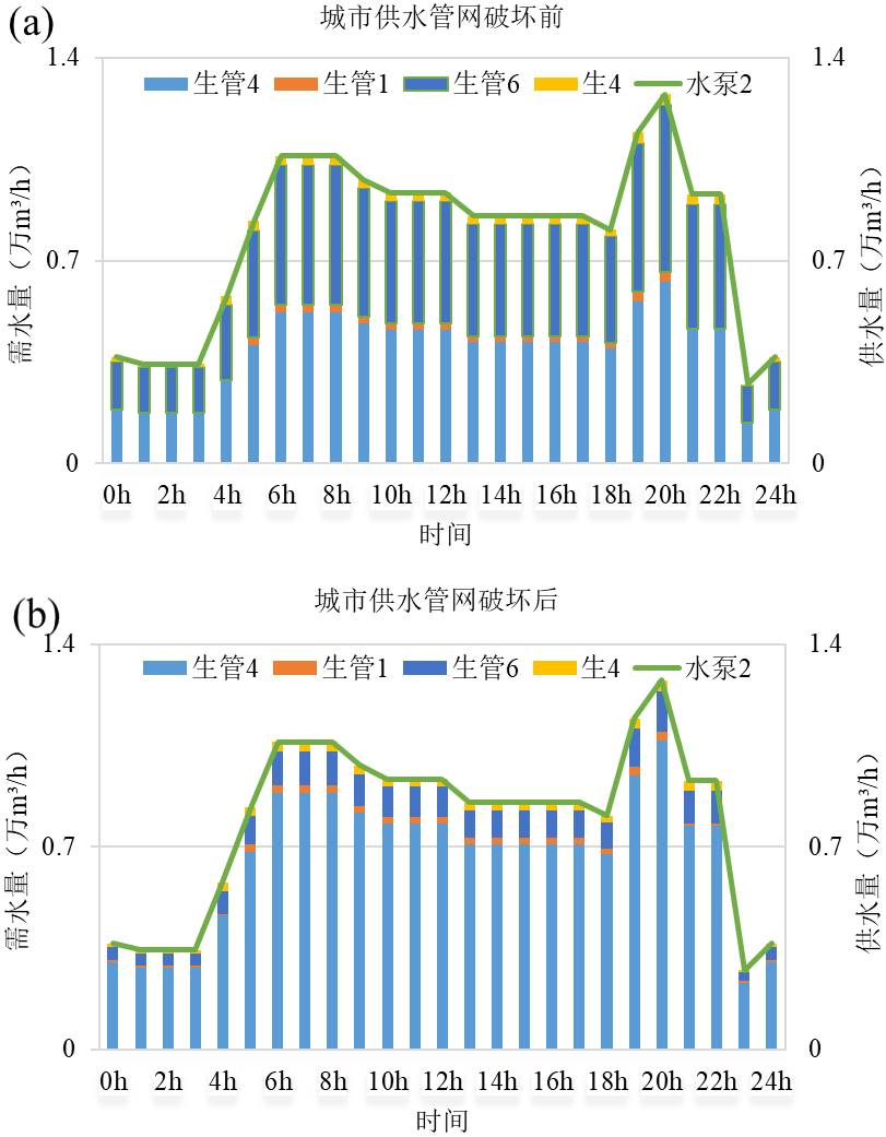图4. 正常工况(a)以及极端工况(b)下工业用水节点10供需水情况