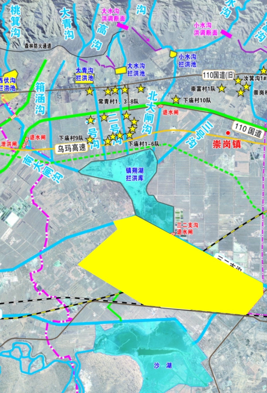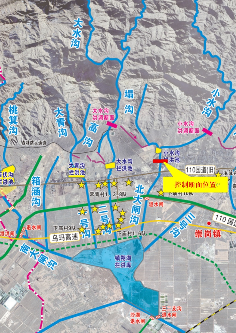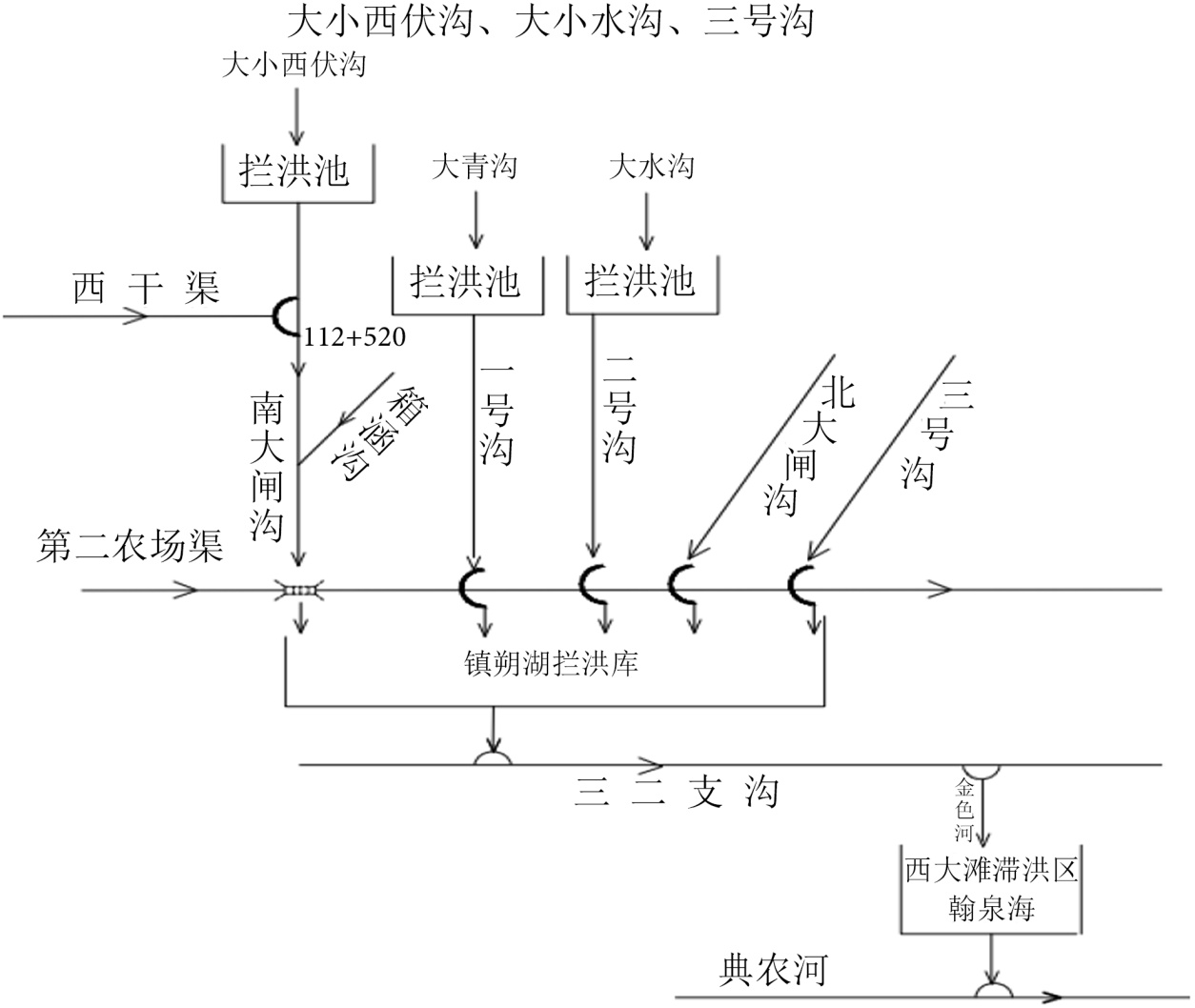 镇朔湖库防洪体系如图1所示,由导洪工程、行洪沟道工程(调洪库)、镇朔湖拦洪库、泄洪沟(闸)工程组成。贺兰山自大西伏沟至大水沟、小水沟间沟道洪水,出山后经贺兰山坡地部分沟道导洪堤、自然沟道、调洪库下泄至110国道,拦洪再经南大闸、一号、二号、北大闸沟四条行洪沟道归入镇朔湖拦洪库。洪水经拦蓄后,由退水沟、泄水闸进入三二支沟、金色河入瀚泉海,最后经典农河(第三排水沟)排入黄河。
