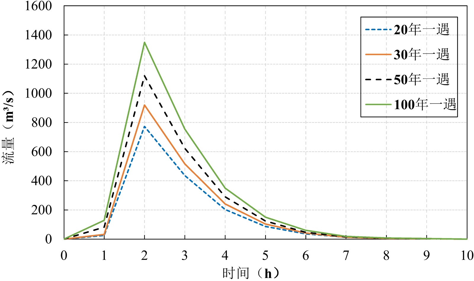 式中:i为产流区平均净雨强度,mm/h;L为概化长度,km。据此求得镇朔湖拦洪库设计洪水计算成果见表1和图2。