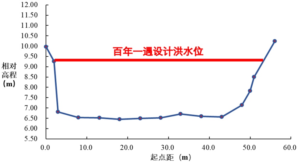 导洪堤过流能力主要根据水力学原理,采用比降面积法,按照洪水调查规范要求,调查计算出所需参数,计算不同水深对应流量的一种方法[9]。具体采用如下公式计算导洪堤不同部位的过流能力(本次仅计算最大过流能力),即: