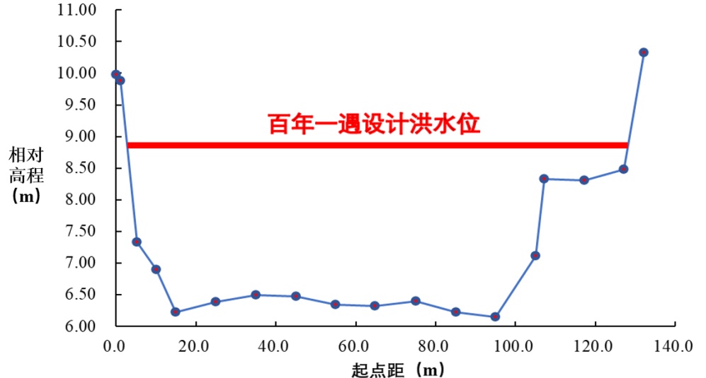 1) 以小水沟为例,开展水文计算和行洪能力复核得出:小水沟现状基本可满足100年一遇洪水过流,在出沟口后可归拢下泄,在经过导洪堤的消减、坦化之后,与小水沟沟口到桥梁之间的区间汇流相互抵消,故北大闸沟桥桥位断面设计洪水直接釆用小水沟及其南侧小沟沟口汇合后设计洪水,则其100年一遇的设计洪峰流量为637 m3/s。