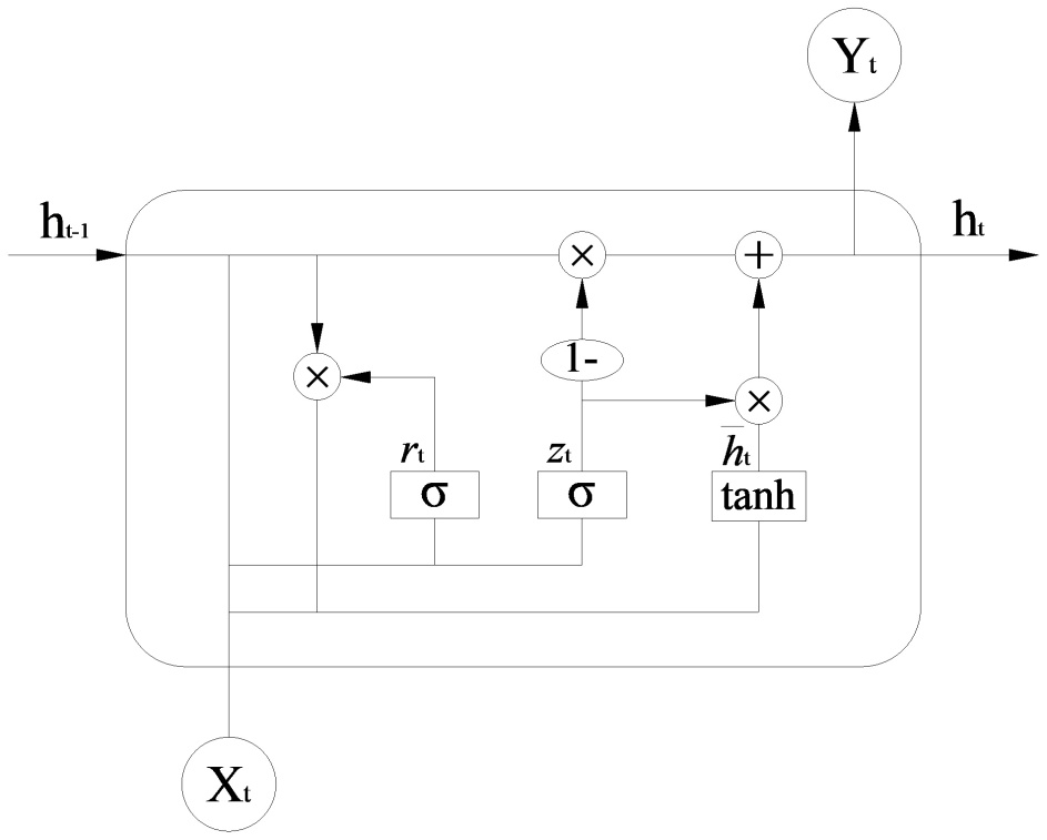 图2为GRU门控制循环单元内部结构,其中重置门和更新门是GRU中的关键组件。重置门决定过去信息对当前状态的影响程度,而更新门控制了新信息和旧信息的融合程度。借助其门控机制的协同作用,GRU能够高效捕捉序列数据中的长期依赖关系。在模型架构上,GRU相较于LSTM更为简洁,这使得其在训练过程中展现出更快的速度[17]。