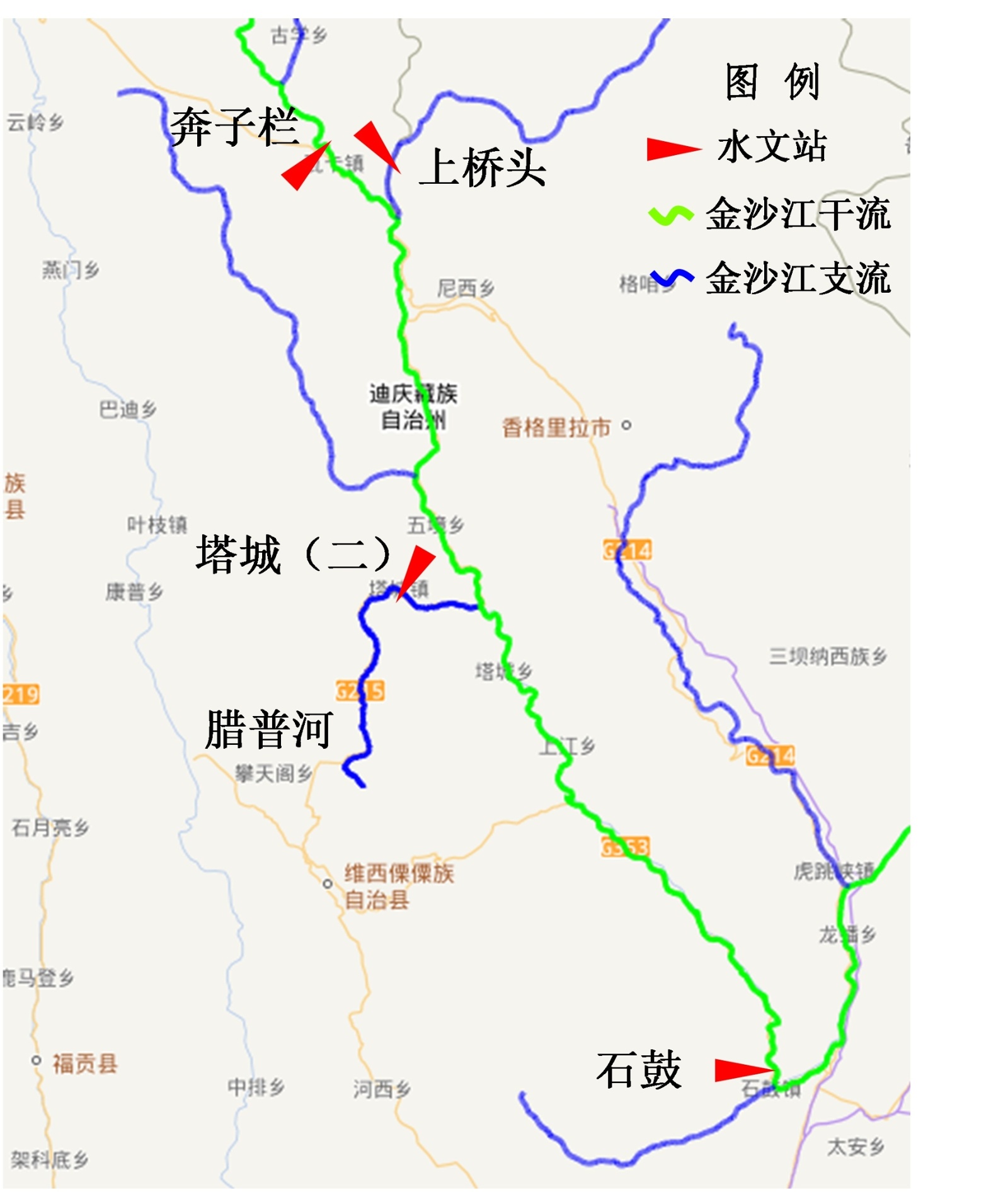 奔子栏–石鼓河段有岗曲河、腊普河等支流汇入,岗曲河控制站为上桥头水文站,腊普河控制站为塔城水文站,基本情况见表1,示意图见图1。