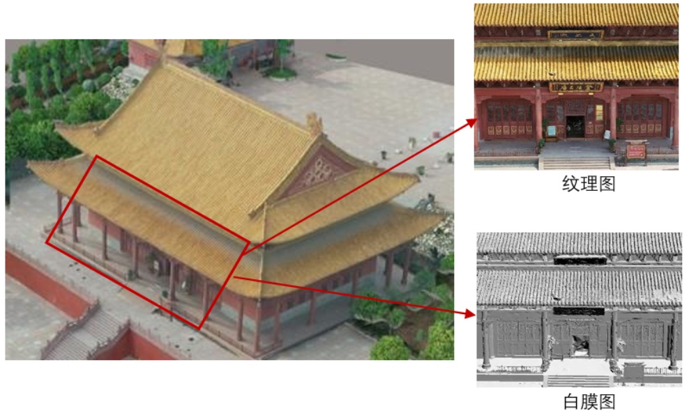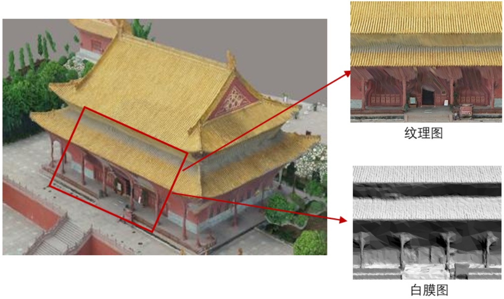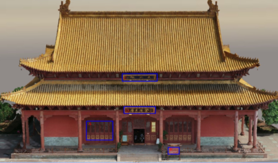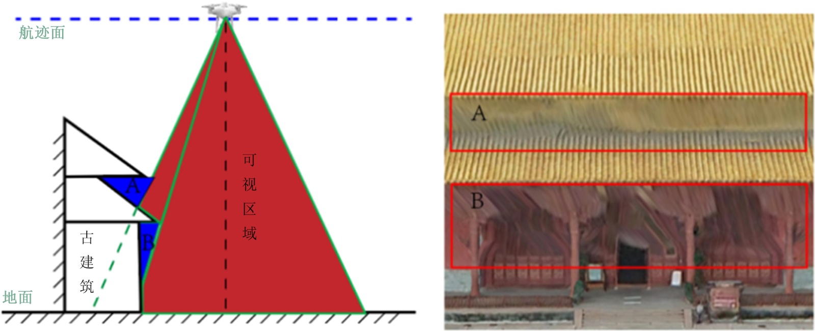 研究建筑具有较宽的屋檐,无人机倾斜摄影技术无法拍到斗拱、牌匾等檐下建筑纹理(如图2(a)蓝色区域A、B为拍摄死角,建模效果对应图2(b)的A、B部分),难以满足该建筑三维模型的应用需求。