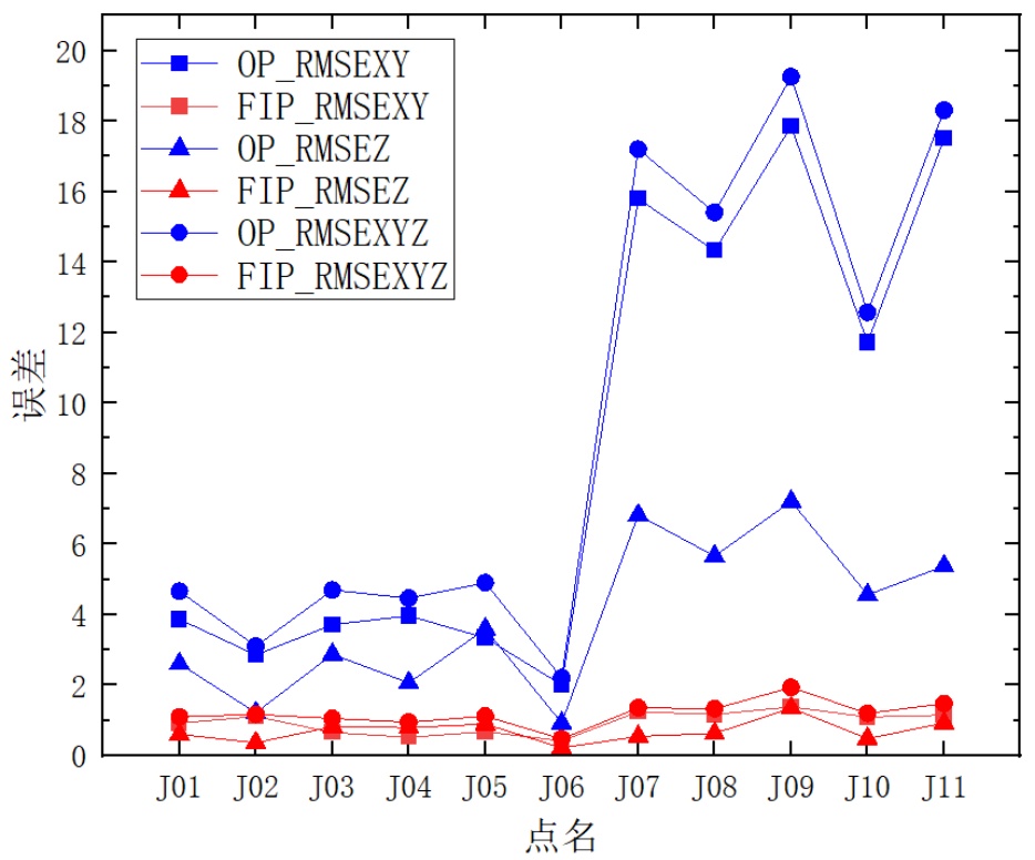 根据待研究对象的特点,本文选用5个控制点和11个检查点,如图1所示。每个检查点测5组数据,求其中误差与传统倾斜摄影测量(Oblique Photogrammetry, OP)比较,从检查点位置精度来验证本文提出方法的优势,两种方法的结果见图5所示。结果表明:从图5中,可以明显地看出,相比于OP,FIP模型在RMSEZ和RMSEXY方面都有明显的改善,检查点误差最大点的位置均处于建筑屋檐下有遮挡的位置。