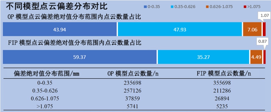 本文以OP模型密集匹配得到的点云为参考,从点云偏差的角度分析FIP方法的可行性,不同模型的点云偏差分布结果如图6所示。研究结果显示,利用OP模型密集匹配的点云数量为536,424,其中偏差绝对值在0.35 mm以内的点云所占百分比总和为43.94%。FIP模型密集匹配算法得到的点云数量为599,113,其中偏差绝对值小于0.35 mm的点云所占百分比总和的59.37%。结果表明,FIP模型密集匹配不仅能够匹配出数量更多的同名像点,也提高了密集匹配点正确率。