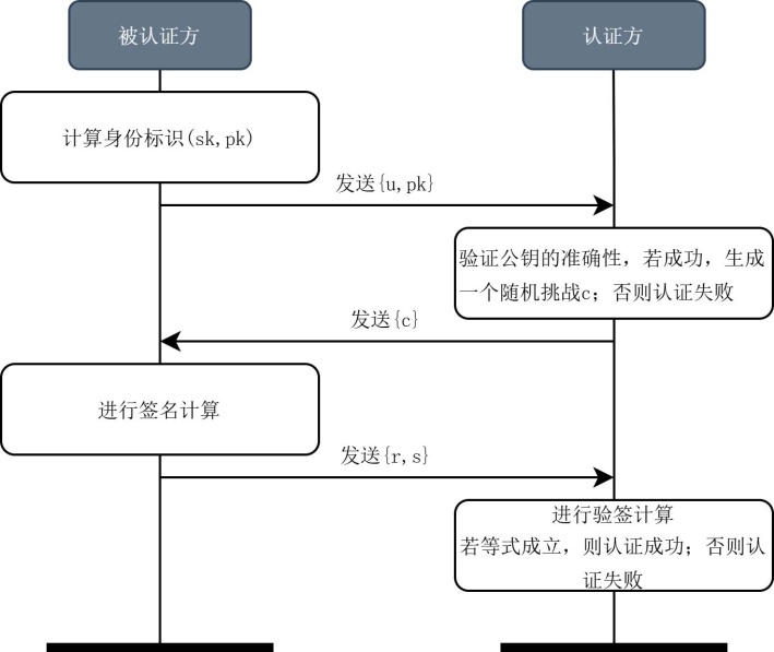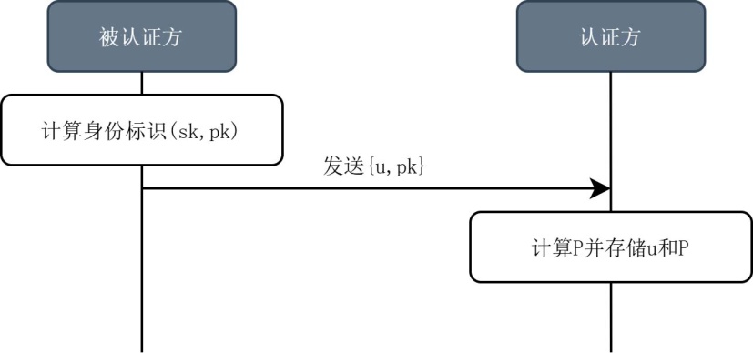 图1所示为身份注册的流程图。在身份注册过程中,主要是由被认证方将其公钥发送给认证方,从而完成身份信息的注册与认证准备。当被认证方首次参与认证过程时,其身份注册的具体流程如下(其中