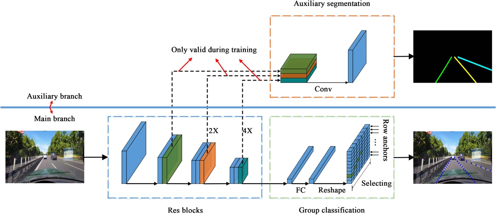 在网络结构上,UFLD由逐行检测分支与辅助分割分支构成,如图1。其中,逐行检测分支通过ResNet主干网络提取全局特征,随后以轻量回归和分类头映射到预定义行锚,实现车道位置预测。而辅助分割分支在训练阶段融合多尺度信息以强化特征表达,但推理时可被裁剪以节省算力。