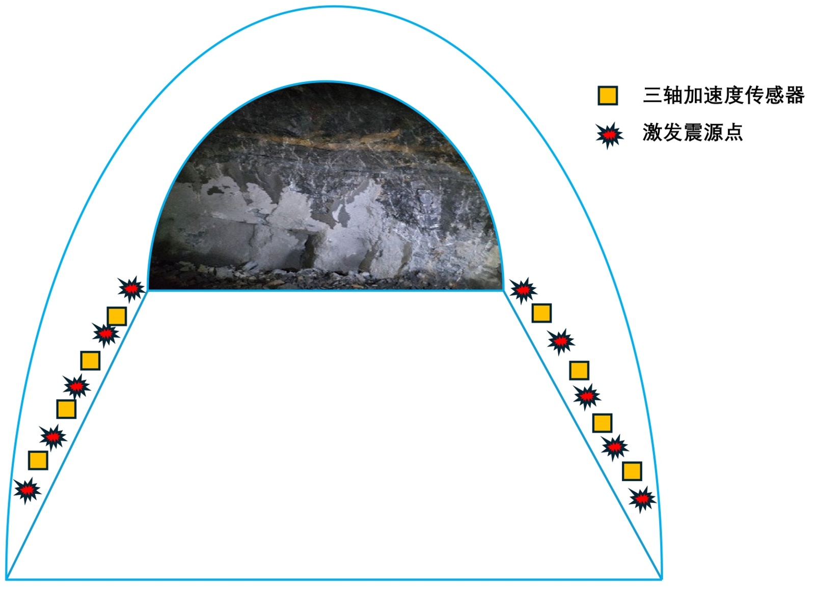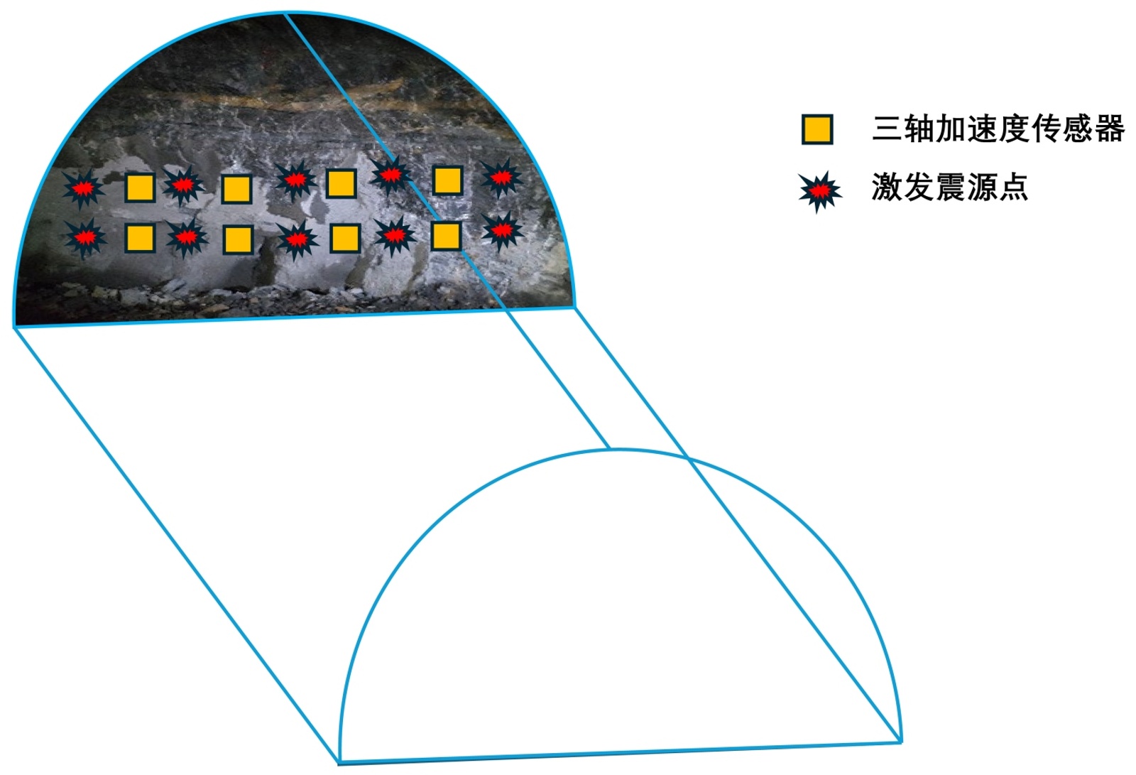 在隧道工程的特定施工段落,通过锤击或小药量爆破在隧道掌子面后方或侧壁制造震源,产生地震波信号,这些地震波以球面波形式沿隧道轴向传播[9]。为了采集反射波数据,采用矩阵式布置的无线三分量传感器(通常不小于8个),同步接收X、Y、Z三轴方向的反射波信号,捕捉空间多角度反射信息,形成三维数据。地震波在不同岩层中传播速度不同,当遇到波阻抗差异界面(如断层、溶洞、破碎带)时会发生反射,反射信号被高精度传感器接收,通过无线传输至主机。最后计算机软件分析反射波的走时、振幅、频率等特征,结合三维空间定位技术:生成纵向、横向二维切片和立体3D地质模型;计算围岩弹性模量、泊松比、密度等力学参数;标注不良地质体的空间位置、规模及与隧道轴线的交线,从而预判隧道掘进掌子面前方及周边区域的地质状况[10]。