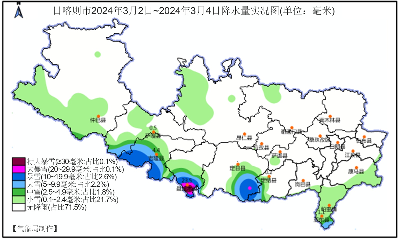 图1. 2024年3月2日~4日降水量实况(通过业务软件自行绘制(基于西藏日喀则市气象局观测数据))