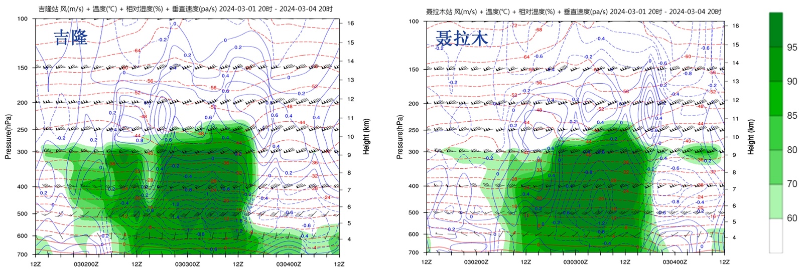 风:黑色(m∙s−1),温度:红色虚线(℃),相对湿度:绿色阴影(间隔5%),垂直速度:蓝色实线(Pa∙s−1)。