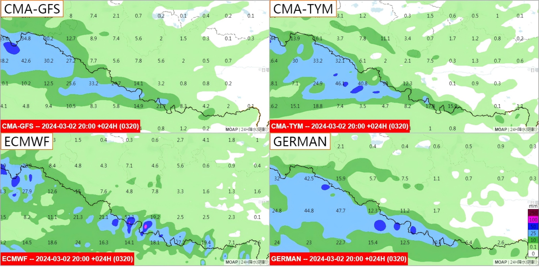 图6. 提前三天的数值模式降水预报
