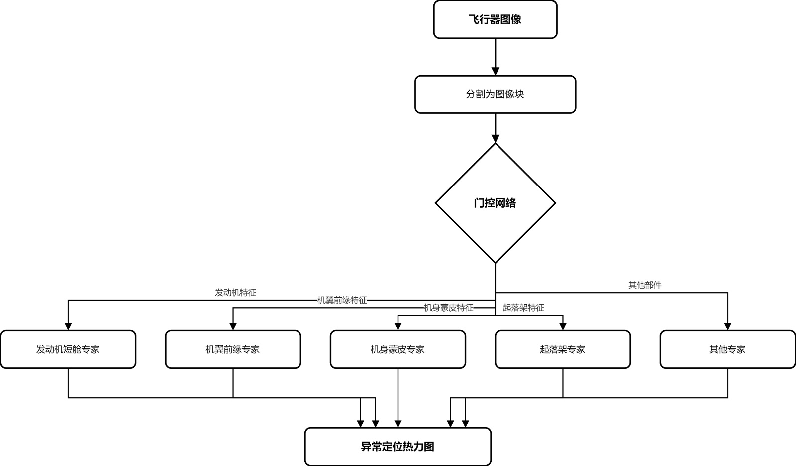 仅使用正常的发动机短舱图像训练)的正常、无缺陷图像进行训练。这种专门化训练[20]使得每个专家都具备了对其负责区域的专家级辨识能力,能够捕捉到该部件特有的细微纹理和光泽,这极大地提高了检测的灵敏度和精度[21] [22]。