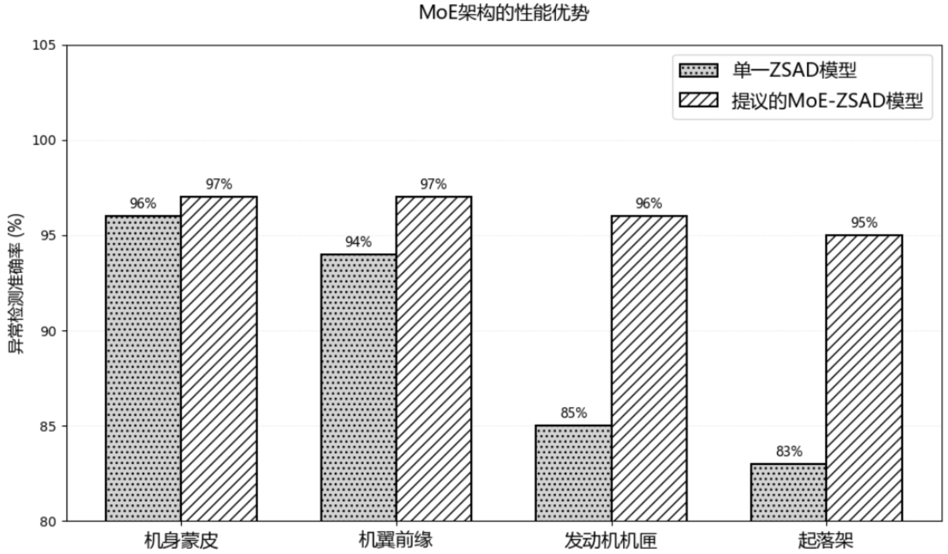 我们提出的MoE-ZSAD系统之所以取得优异性能,源于其关键技术组件的协同效应与深度整合。首先,DINOv3视觉基础模型提供了一个强大而通用的特征空间。它通过在数十亿张无标签图像上的自监督学习,学会了理解图像的底层结构、纹理和高级语义,为后续的异常判断奠定了坚实基础。其次,零样本异常检测框架将问题从识别有限的已知缺陷转变为理解无限的正常模式,这是一种认知层面的范式转变。它从根本上解决了新发、未知缺陷的检测难题,使得系统具备了应对开放世界挑战的能力。最后,混合专家架构作为一种有效的归纳偏置,将“飞机是由不同视觉特性的部件组成”这一领域先验知识巧妙地融入模型设计中。这种分解式分析避免了模型试图学习一个模糊的、适用于所有部件的平均正常表征,而是为每个部件构建了精确、专门的正常模型,从而大幅提升了检测的灵敏度和准确性。