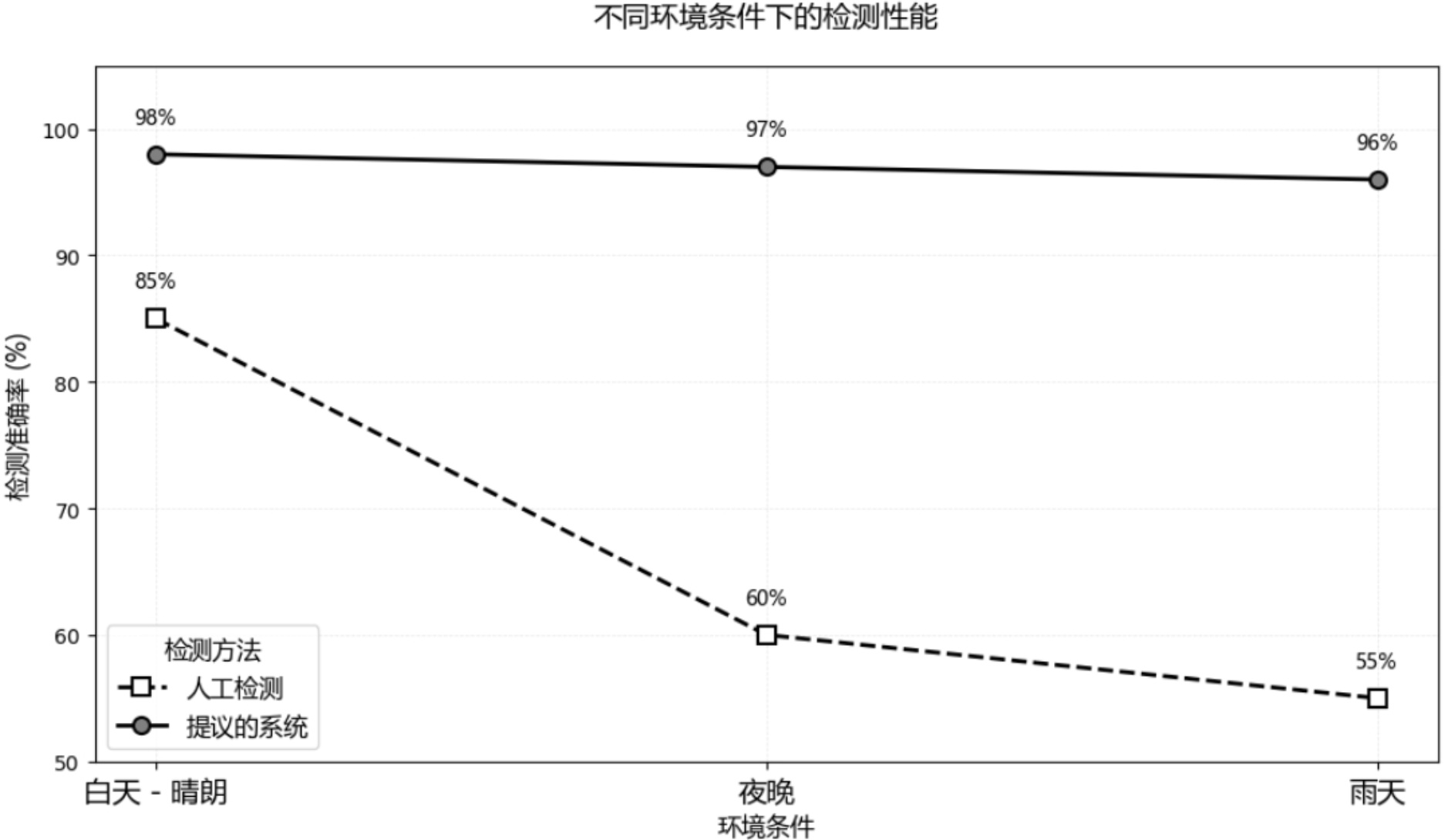 我们发现,仅依赖可见光的人工检查或传统自动化系统,其准确率在不利条件下会大幅下降(从白天的约85%下降至60%以下)。而我们的系统得益于红外热像仪和主动激光成像系统的多模态数据融合,其检测性能(AUROC始终保持在0.96以上)几乎不受光照和天气变化的影响,这展示了我们的设计在真实机场环境中进行24/7全天候作业的强大适应能力。