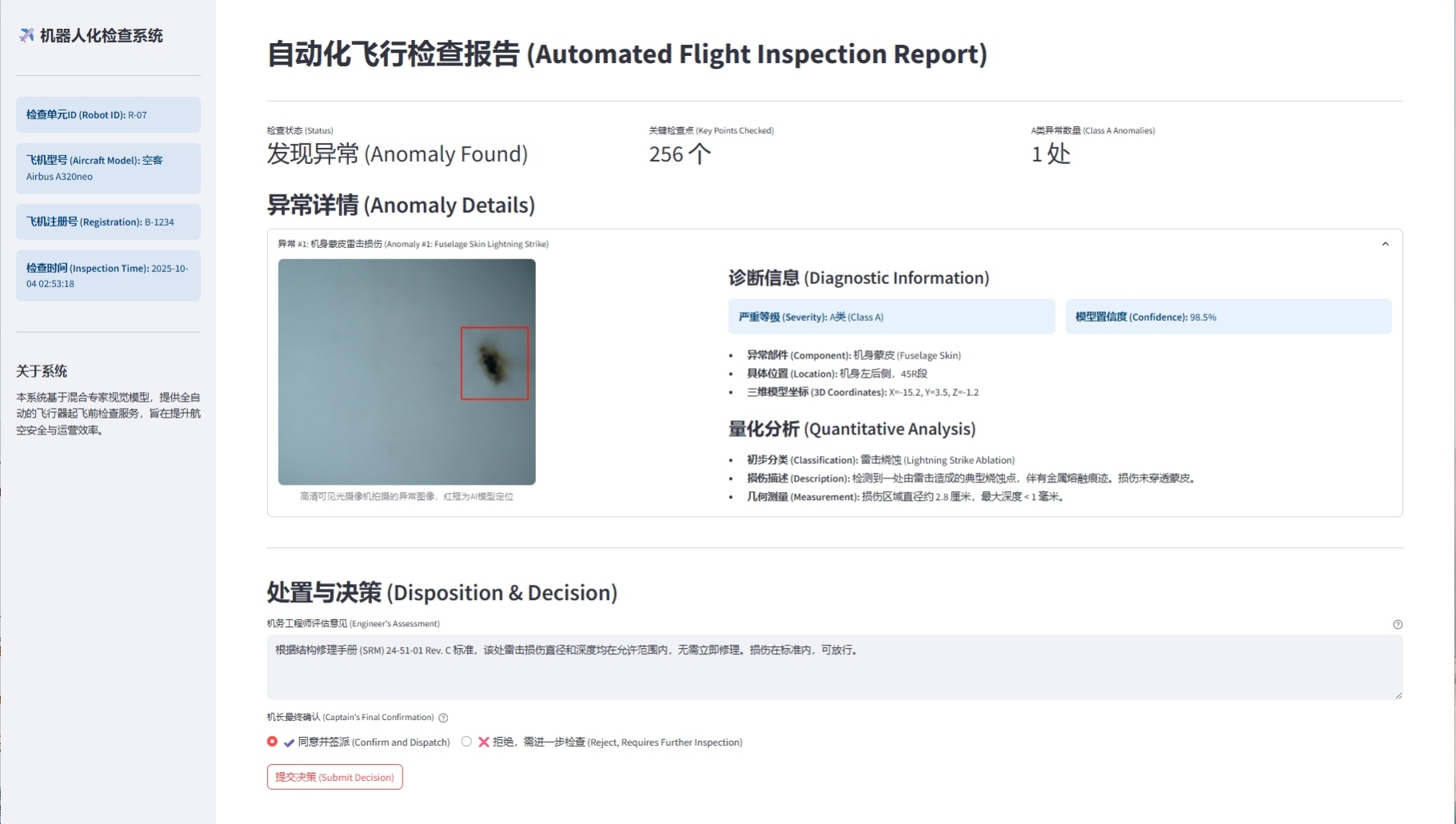 (3) 推动数字化转型:我们的系统自动生成的、不可篡改的数字化检查报告为每一次飞行都创建了永久性的健康档案。这些海量数据可用于整个机队的健康状态监控、预测性维护计划的制定以及维修策略的优化,推动航空维修从传统的被动响应向现代的主动预测范式转变[26]。
