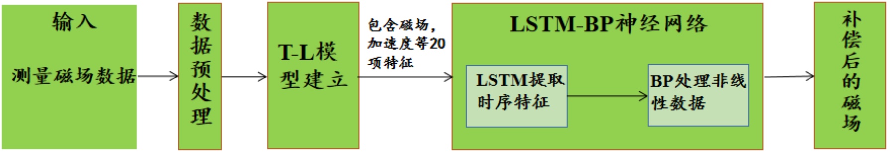 该方法首先利用LSTM网络提取由地磁场变化引起的干扰磁场中所蕴含的时序依赖关系,再通过BP网络进一步挖掘残余干扰中的非线性映射特征,从而实现对复杂干扰的精确建模。在传统Tolles-Lawson (T-L)模型完成线性干扰初步补偿的基础上,LSTM-BP模型对残余噪声进行学习与拟合,有效抑制标量磁场测量中的非线性干扰成分,进一步提升了航磁数据的补偿精度。