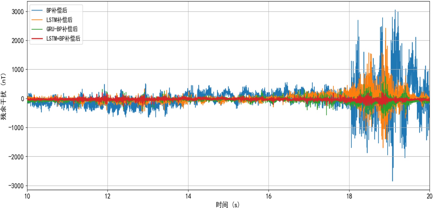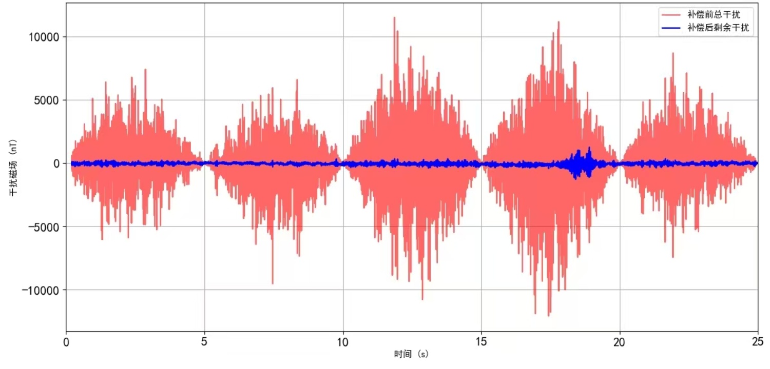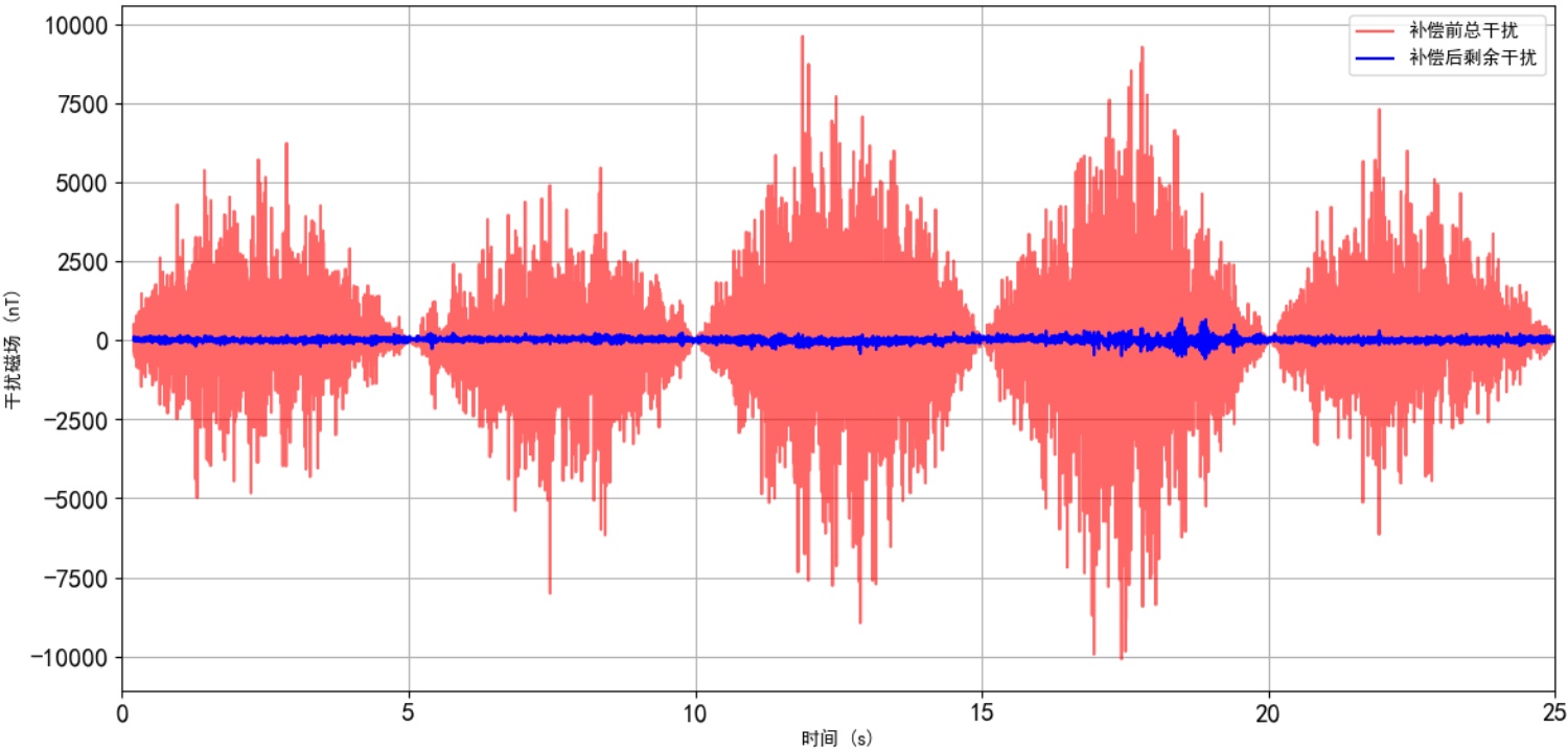 在基于T-L模型仿真生成干扰磁场数据的基础上,本文分别采用LSTM-BP、GRU-BP、BP神经网络以及LSTM神经网络进行补偿对比。通过补偿后改善比的定量分析可知,LSTM-BP算法在抑制非线性干扰方面表现最为优越,使补偿后的标量磁场峰峰值显著降低,充分验证了其可行性与性能优势。