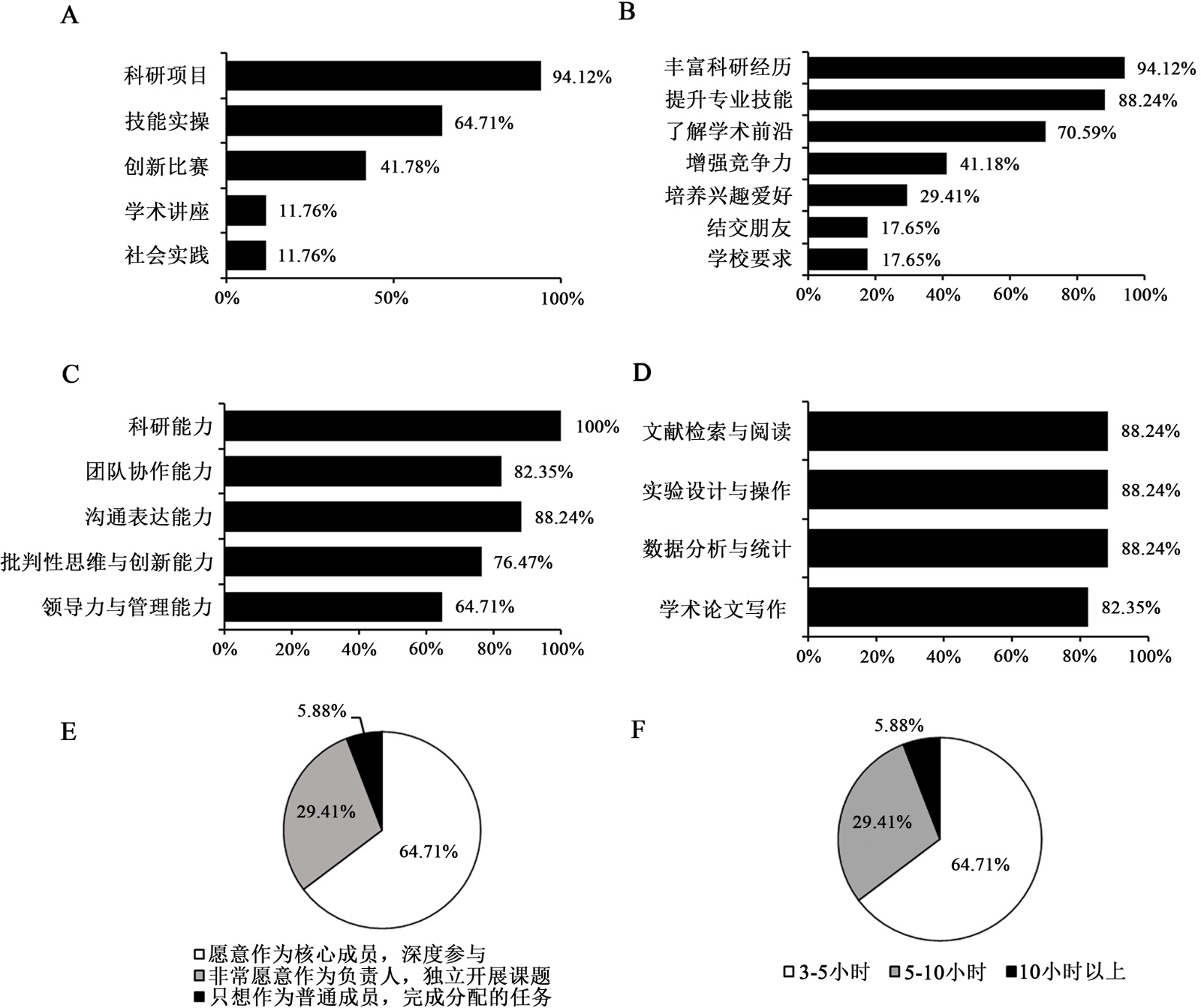 进一步调查发现,学员们尤其对科研能力的形成具有极高期待和热情(如图1(C)),他们之中的大部分明确选择进入实验室开展第二课堂学习,围绕科研能力提升,大部分学员希望能够获得全面的发展:在文献检索与阅读、实验设计与操作、数据分析与统计以及学术论文写作方面均能够有所收获(如图1(D))。但是,在所有被调查学员中,仅29.41%的学员愿意作为课题负责人独立开展课题(如图1(E))。在与学员座谈过程中,我们了解到,医学专业学员第一课堂课业繁重、军医大学管理严格也是限制学员主动承担科研课题的重要原因,大部分学员(64.71%)每周仅有3~5小时的有效时间前往实验室进行实验操作(如图1(F)),且不同专业、不同年级学员的课余时间差异较大,因此,仅在实验室里进行线下第二课堂学习并不能满足学员需求,更难以实现提升学员科研创新能力的目标。问卷显示,70.59%的学员的确也更倾向于通过线上线下相结合的方式参与第二课堂。