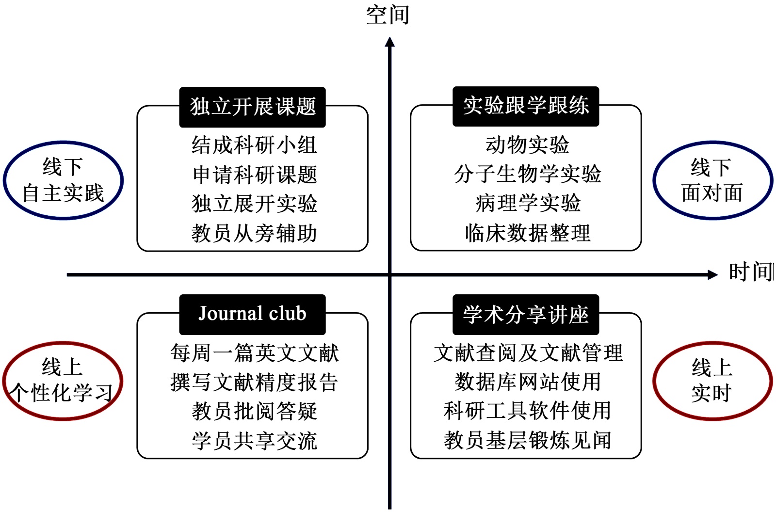 上述调研结果提示,科研创新是被调查学员开展第二课堂的首要需求,而线上线下相结合的方式是更适合于军医大学学员的第二课堂学习模式。我们在充分考虑了国家政策、院校特色和学生需求的基础上,形成了以科研素养形成为核心,军事医学课题为载体,实验技能为抓手的第二课堂教学目标,帮助学员们掌握文献查阅方法及基础实验技能、初步形成独立开展基础医学课题的能力并养成良好的学术价值观[4] [5]。同时,考虑到学员们的第一课堂学习任务重,不同学员参加第二课堂的时间存在差异等现实情况,我们建设了基于混合式教学模式的本科生第二课堂,并在本实验室进行了初步实践。