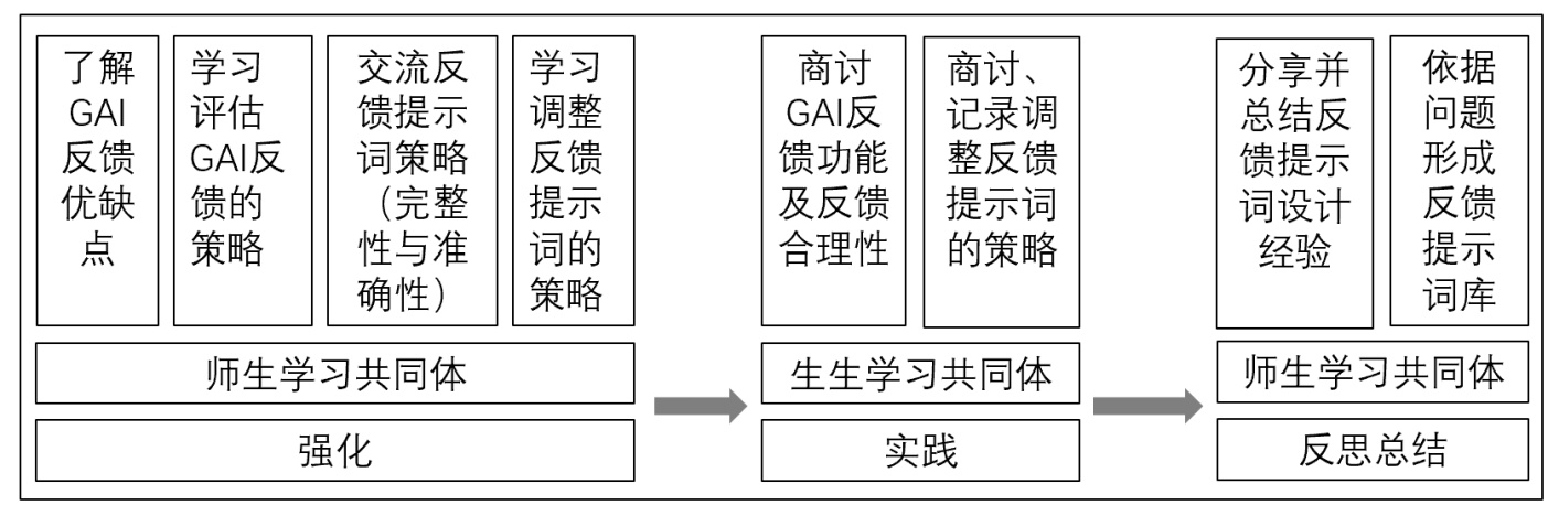 实践阶段,学生首先独立完成初稿,接着发布提示词,获取GAI反馈,独立思考GAI反馈合理性并调整提示词,获得新一轮反馈。对于仍然无法达到预期的反馈,生生学习共同体讨论原因:GAI反馈能力不足还是提示词存在问题。如是前者记录下来为后期总结做准备,如是后者,生生商讨改进提示词,同样记录改进提示词的策略。