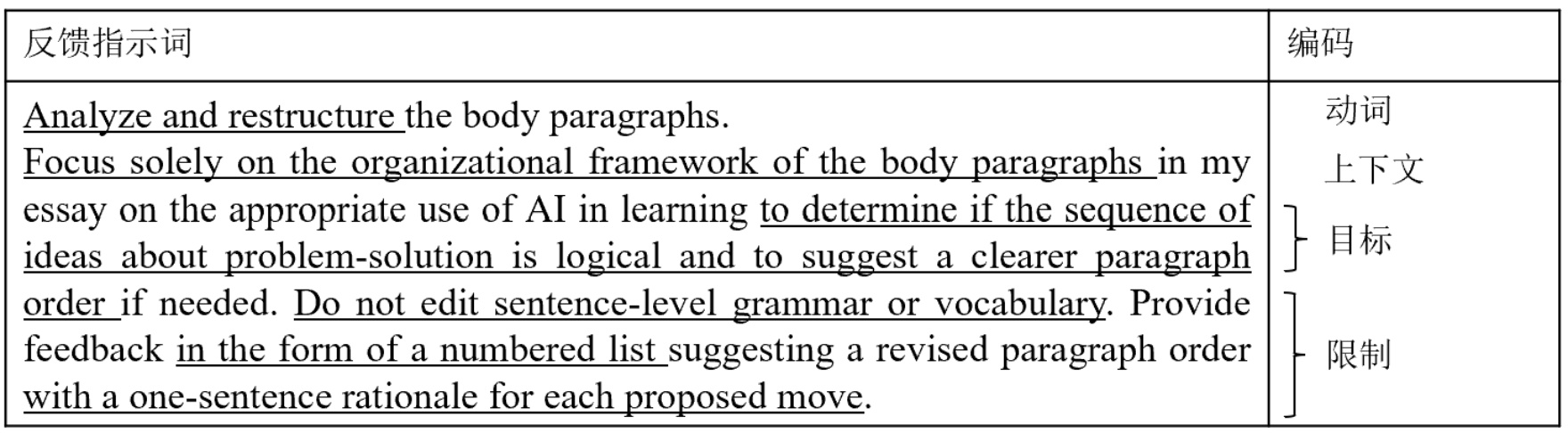 数据分析包括两个部分:1) 提示词要素分析和提示词调整策略分析,2) 学生对GAI反馈功能的认识和评估GAI反馈的策略。首先,以Eager和Brunton (2023) [20]的提示词素养构成模型为基础,并根据本研究的二语写作情境将反馈提示词分为四个要素:动词(规定GAI反馈行为)、上下文(说明GAI反馈范围)、目标(说明GAI反馈需达到的目标)和限制(规定GAI反馈需遵循的规则)。按照这四个要素分析学生发布的多轮提示词特征和学生调整提示词的策略。编码示例如图(见图2)。其次,通过主题分析法分析反思报告,揭示学生如何看待GAI反馈功能和如何评估GAI反馈。