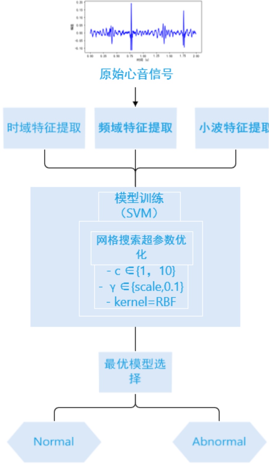 多模态特征的互补性:融合时域统计、频域谱质心及小波能谱熵的特征向量,能够从不同维度刻画心音信号的非平稳特性。实验表明,该融合策略比单一特征域提供了更具判别力的特征表示。