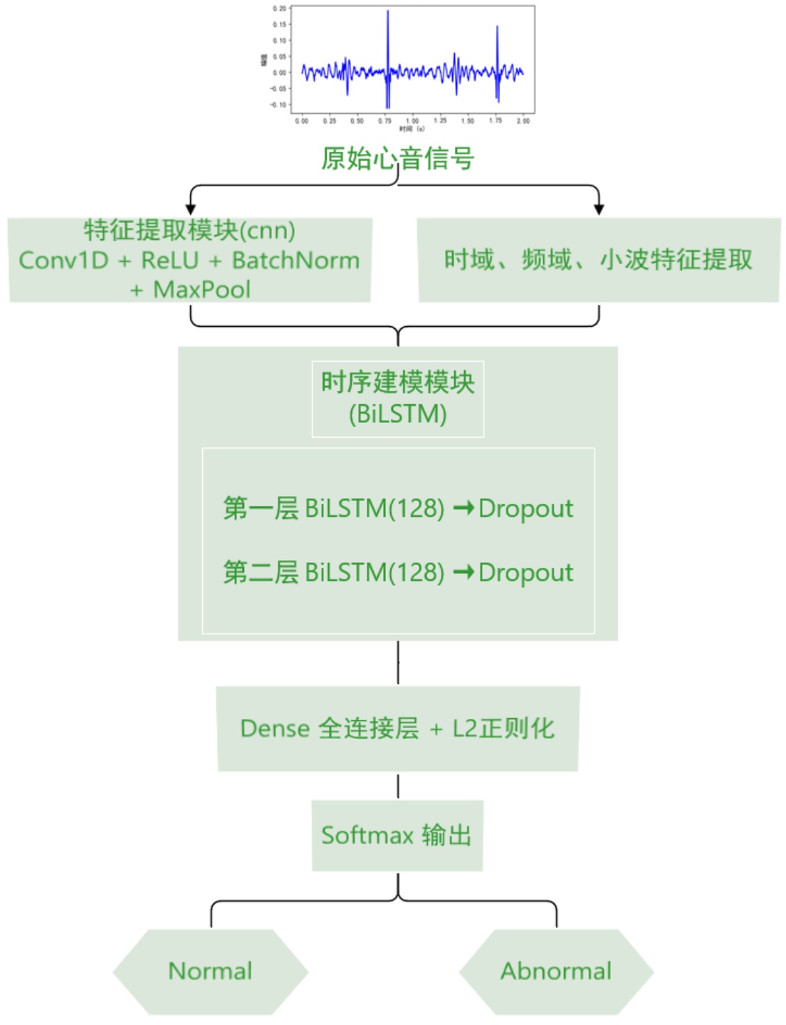 针对上述问题,本文提出一种基于多模态特征融合与集成学习的心音异常检测方法,主要贡献如下:(1) 数据增强:提出异常类别导向的增强策略,通过针对性扰动异常样本解决数据不平衡问题,提升模型敏感性;(2) 特征融合:综合提取时域统计、频域谱质心及小波域能量熵等多层次特征,构建兼顾全局与局部的特征空间;(3) 模型架构:设计CNN-BiLSTM深度神经网络,利用卷积层提取局部特征,双向LSTM捕捉长时依赖,相比单一模型显著提升了分类性能。