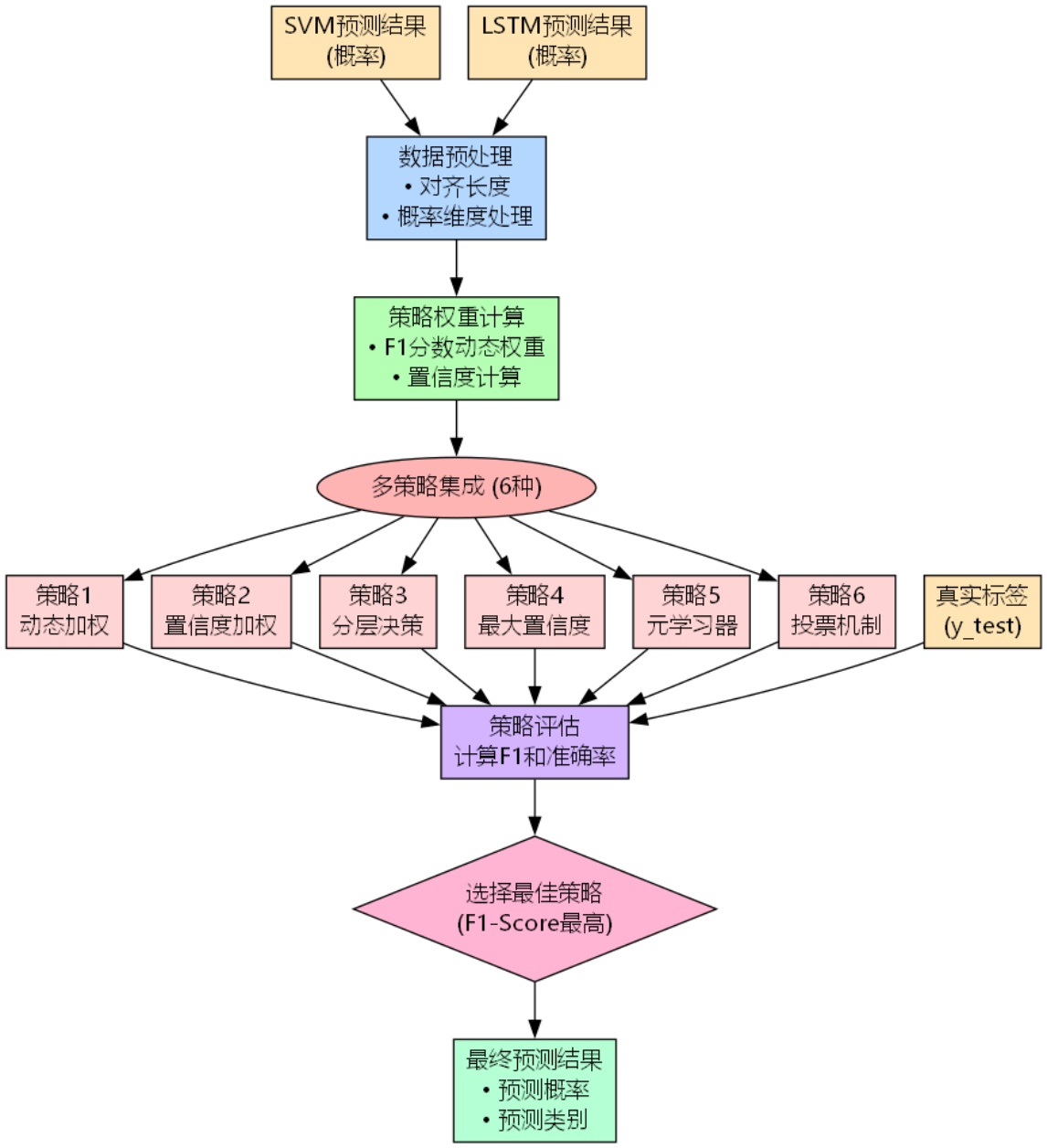 为兼顾分类精度与泛化能力,本研究设计了六种策略融合SVM与CNN-BiLSTM的预测结果(记为