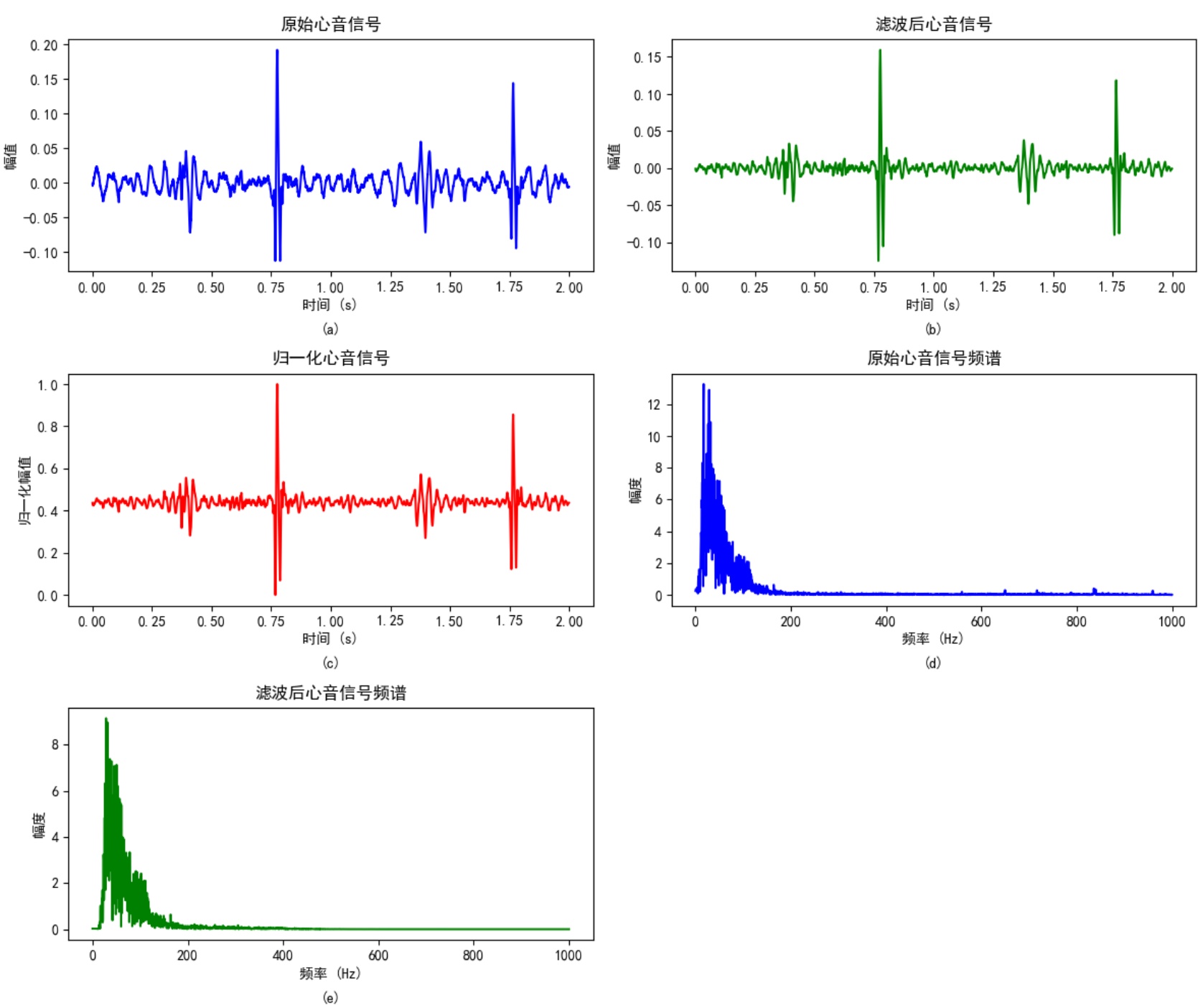 图4. 心音信号的预处理,(a) 原始心音信号;(b) 滤波后的心音信号;(c) 经过滤波和归一化处理的心音信号;(d) 原始心音信号的频谱图;(e) 心音信号经过滤波后的频谱图