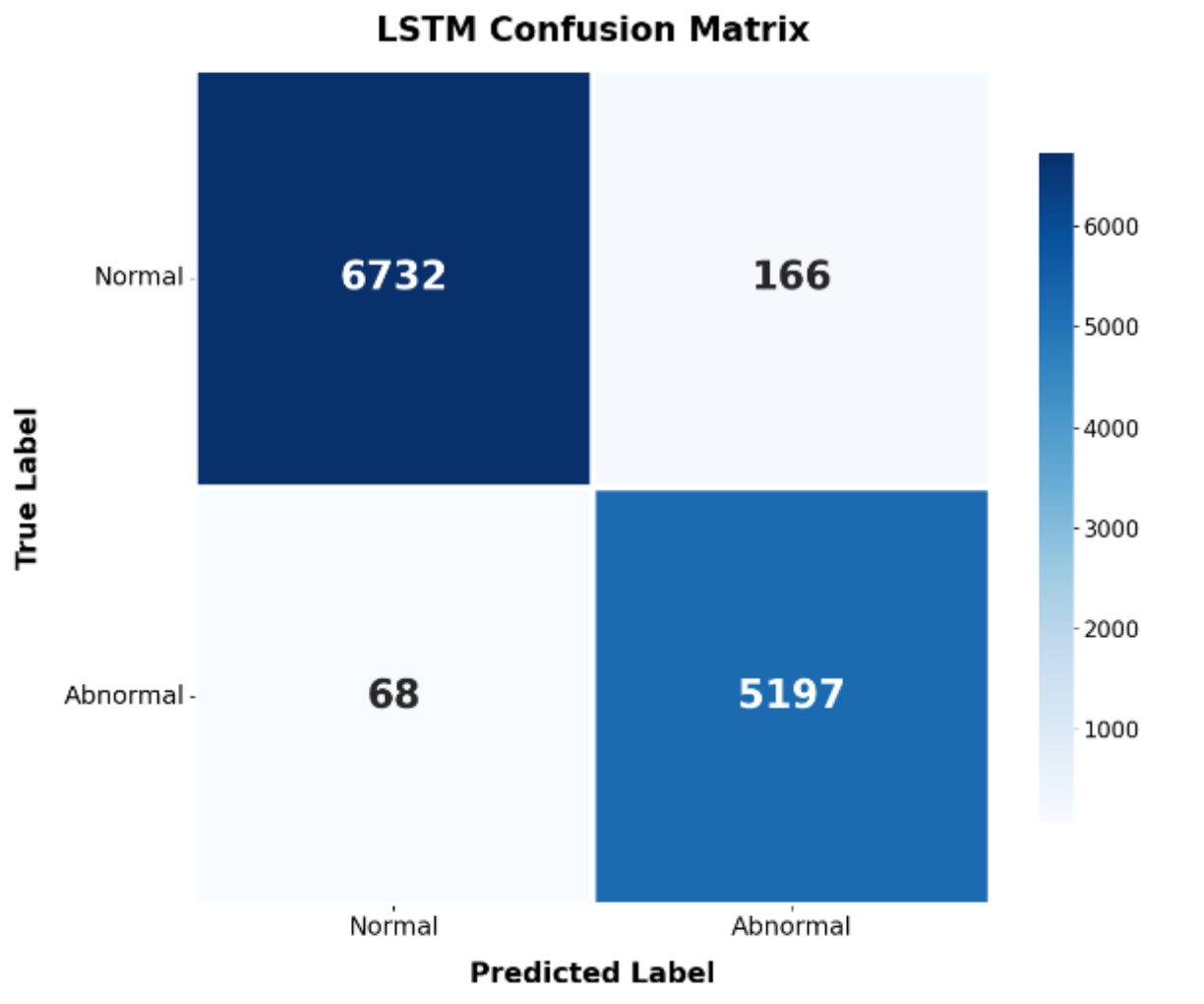 相比之下,图7为SVM模型的混淆矩阵,显示其对正常类(6809个正确预测)与异常类(5208个正确预测)的区分效果更为稳定,整体表现略优于LSTM。其AUC值达到0.9985,与LSTM相当甚至略高。图8展示了LSTM训练过程。