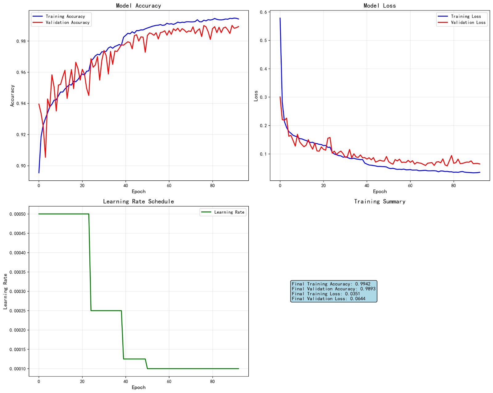 从图6 LSTM的混淆矩阵可以看出,该模型在识别正常与异常心音时表现较为均衡,其中正常类别的预测正确数为6732,异常类别的预测正确数为5197,整体准确率达到98.93%。同时,训练过程曲线表明模型在收敛过程中训练集与验证集的准确率逐渐接近,最终训练准确率为99.42%,验证准确率为98.93%,且无明显过拟合迹象。