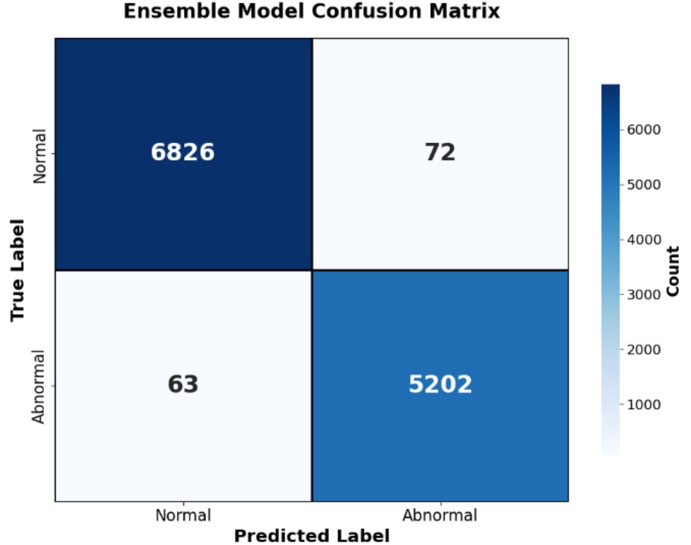 性能提升与复杂度的权衡:本研究的集成框架虽然因多模型并行导致计算开销高于单一模型,但在医疗诊断中,降低“漏诊率”(False Negative)的价值远高于毫秒级的推理速度。本方法将召回率提升至0.9880,显著降低了漏诊风险。这种以适度增加计算成本为代价换取更高诊断安全性的策略,在临床应用中具有高度的必要性与合理性。