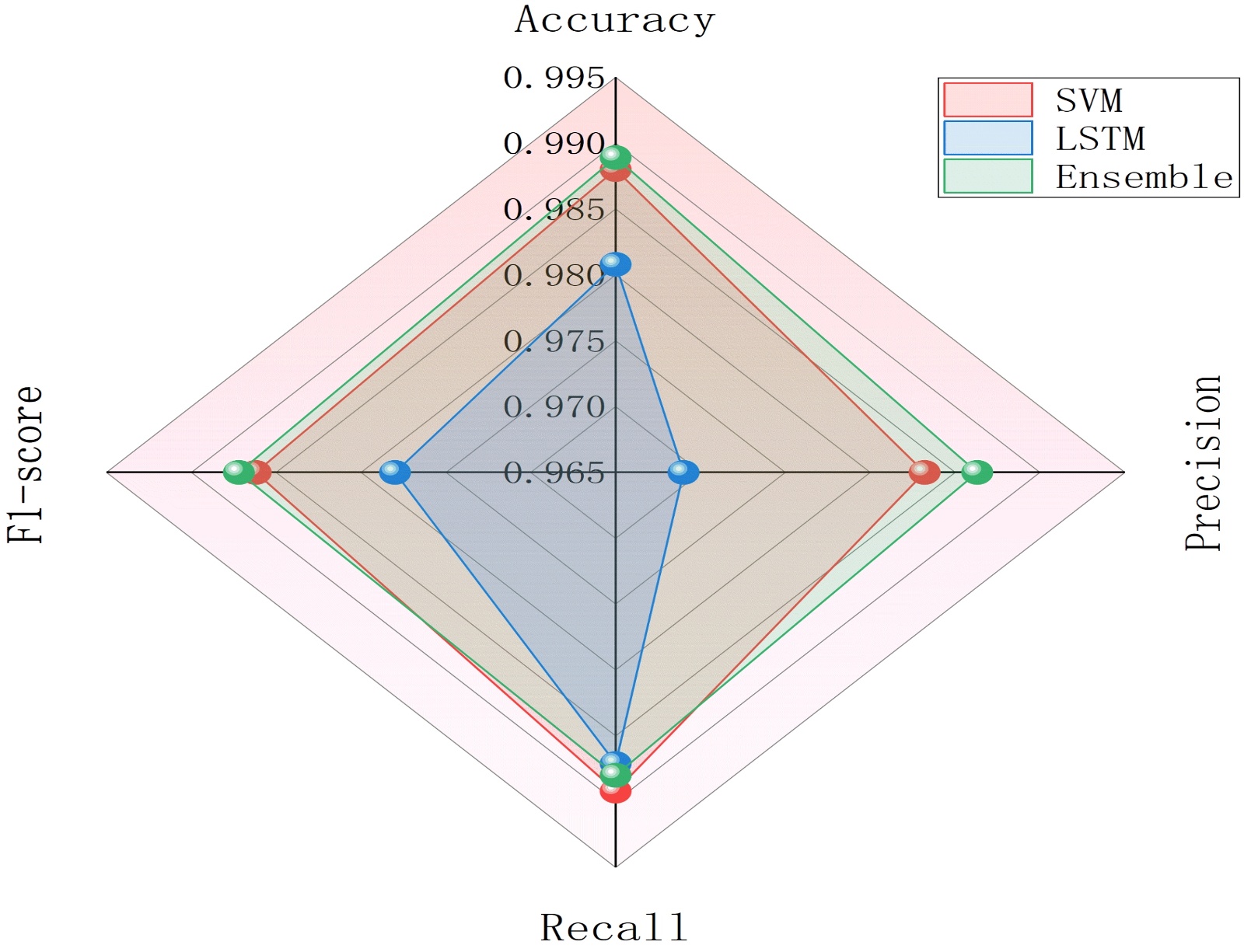 Figure 10. Comparison of SVM, LSTM, and ensemble methods in terms of Accuracy, Precision, Recall, and f1 score